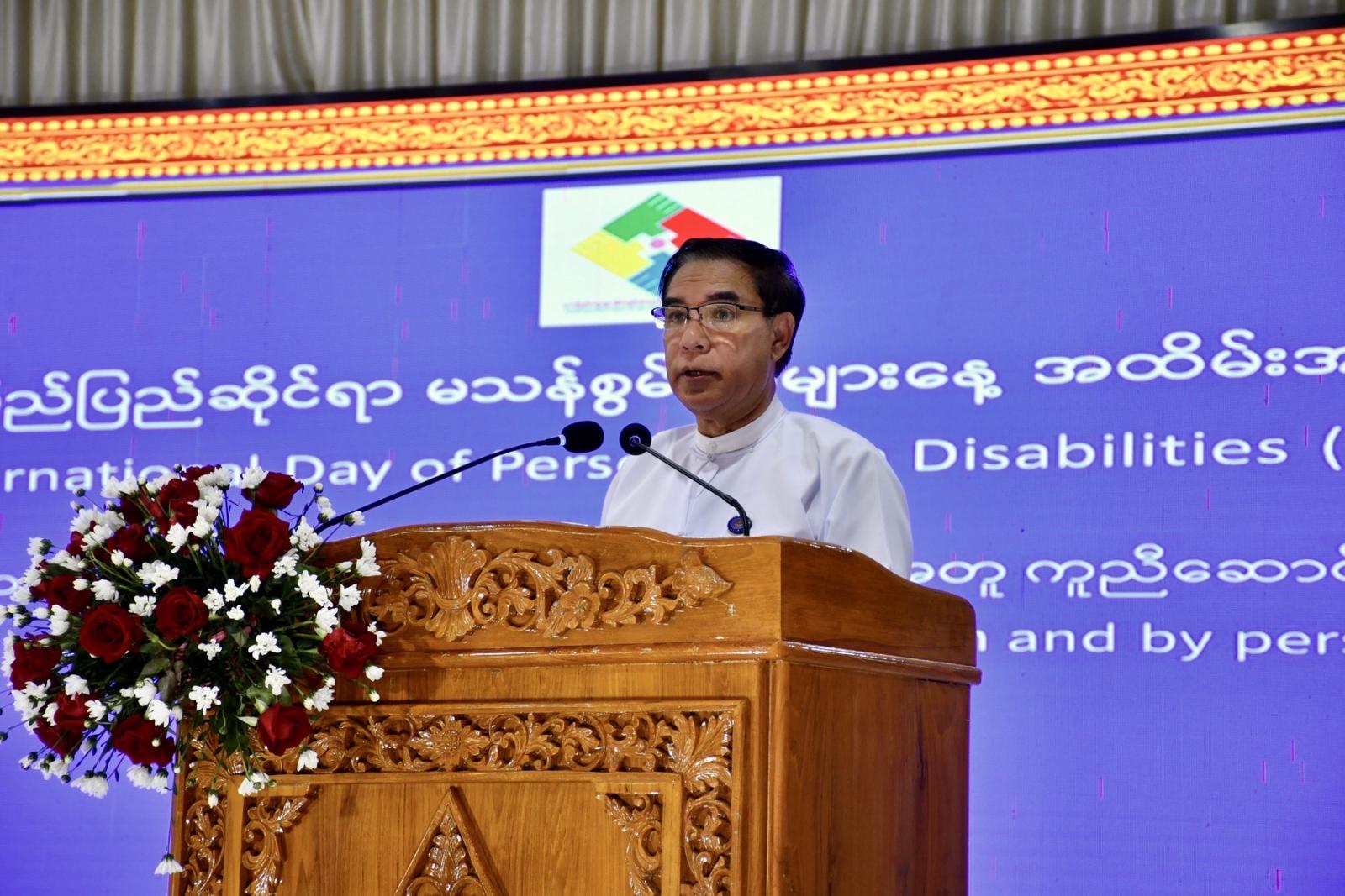 ရှေးဦးစွာ တိုင်းဒေသကြီး ဝန်ကြီးချုပ် ဦးမျိုးဆွေဝင်းက အပြည်ပြည်ဆိုင်ရာ မသန်စွမ်းသူများနေ့ အထိမ်းအမှတ်အခမ်းအနားအား မသန်စွမ်းမှုဆိုင်ရာအရေးကိစ္စတို့ကို သဘောပေါက်နားလည်နိုင်စွမ်း မြှင့်တင်ရန်နှင့် မသန်စွမ်းသူများ၏ ဂုဏ်သိက္ခာ၊ အခွင့်အရေးများ၊ ကောင်းကျိုးစီးပွားတို့အတွက် ပံ့ပိုးဆောင်ရွက်နိုင်ရေး စည်းရုံးလှုံ့ဆော်နိုင်ရန် ကျင်းပရခြင်းဖြစ်ပြီး နိုင်ငံရေး၊ လူမှုရေး၊ စီးပွားရေးနှင့် ယဉ်ကျေးမှုနယ်ပယ်တို့တွင် မသန်စွမ်းသူများ ပါဝင်ဆောင်ရွက်ခြင်းဖြင့် အကျိုးကျေးဇူးများရရှိနိုင်ကာ အသိပညာမြှင့်တင်နိုင်ရေး ရည်ရွယ်ကျင်းပရခြင်းဖြစ်ကြောင်း၊ မသန်စွမ်းသူများ၏ အခွင့်အရေးများ စဉ်ဆက်မပြတ်ဖွံ့ဖြိုးတိုးတက်စေရန် ဆောင်ရွက်ရာမှာ မည်သူတစ်ဦးတစ်ယောက်မျှ နောက်ကျမကျန်ရစ်စေရေးသည် အရေးကြီးကြောင်း၊ ယခုနှစ်ဆောင်ပုဒ်ဖြစ်တဲ့ “စဉ်ဆက်မပြတ်ဖွံ့ဖြိုးဖို့မသန်စွမ်းသူများနှင့်အတူ ကူညီဆောင်ရွက်စို့” ဆိုသည့် ဆောင်ပုဒ်နှင့်အညီ မသန်စွမ်းသူများအတွက် စဉ်ဆက်မပြတ် ဖွံ့ဖြိုးတိုးတက်မှုများရရှိစေရန် ကူညီဆောင်ရွက်တဲ့ လုပ်ငန်းရပ်တိုင်းမှာ မသန်စွမ်းသူများပါဝင်စေမှသာ ပိုမိုပြည့်စုံမှုရှိမှာဖြစ်ကြောင်းနှင့် မသန်စွမ်းသူများအတွက် အခွင့်အလမ်း၊ အခွင့်အရေးများကိုအများနည်းတူ ရရှိခံစားနိုင်စေရန် သက်ဆိုင်ရာဌာန၊ အဖွဲ့အစည်းအသီးသီးက မိမိတို့သက်ဆိုင်ရာကဏ္ဍအလိုက် တတ်စွမ်းသရွေ့ ဆက်လက်ပူးပေါင်းပါဝင် ဆောင်ရွက်ပေးကြစေလိုကြောင်း ပြောကြားခဲ့သည်။