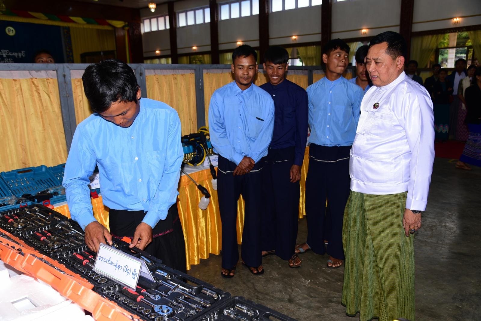 ဆက်လက်၍ ဒေသဖွံ့ဖြိုးရေးလုပ်ငန်းသုံးပစ္စည်းများ ပေးအပ်ရာ ရှမ်းပြည်နယ်ဝန်ကြီးချုပ် ဦးအောင်ဇော်အေးက ဘော်နင်းကျေးရွာရှိ (၅)ဦးအတွက် Air Comperssor ၊ ဖိအားမြှင့်ရေဖြန်းစက်၊ ဘတ္ထရီအားသွင်းစက်၊ ဘောက်စပန်နာ(၆၄)မျိုး၊ လက်ကိုင်ဖောက်စက်၊ (ဘတ္ထရီအမျိုးအစား)ပေးအပ်၍လည်းကောင်း၊ ပြည်နယ်လုံခြုံရေးနှင့် နယ်စပ်ရေးရာဝန်ကြီးက အလယ်ချောင်ကျေးရွာ (၅)ဦးအတွက် ဆီထုတ်စက်ပေးအပ်၍လည်းကောင်း၊ ပြည်နယ်စီးပွားရေးရာဝန်ကြီးက ကန်တန်ကျေးရွာ(၅)ဦးအတွက် StandDrill ၊14" High Speed Cutter ၊Portable Welding Machine ၊ Hand Drill(lmpact) Hand Grinderပေးအပ်၍ လည်းကောင်း၊ ပြည်နယ်သယံဇတရေးရာဝန်ကြီးက ကက္ကူကျေးရွာ(၅)ဦးအတွက် Oven၊ ဂျုံမွှေစက်ပေးအပ်၍လည်းကောင်း၊ ပြည်နယ်လူမှုရေးရာဝန်ကြီးက လက်ပံပင်ကျေးရွာ(၅)ဦးအတွက် ဆီထုတ်စက်ပေးအပ်၍လည်းကောင်း၊ ပြည်နယ်လမ်းပန်းဆက်သွယ်ရေးဝန်ကြီးက မိုင်းသောက် ကျေးရွာ(၅)ဦးအတွက် တုံးလုံးချား၊ ချားခုံနှင့် စည်းကောက်ခုံ လက်ရက်ကန်းစင်၊ အထည်တင်စင်များကို အသီးသီး ပေးအပ်ခဲ့ကြသည်။