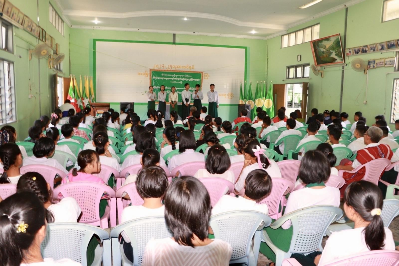 ရှေးဦးစွာ ထုံးကြီးစံပြကျေးရွာ အခြေခံပညာအလယ်တန်းကျောင်း(ခွဲ)မှ ကျောင်းသား/သူများက တိုင်းရင်းသားသီချင်းဖြင့်သီဆိုဖျော်ဖြေကြပြီး ပဲခူးတိုင်းဒေသကြီးအစိုးရအဖွဲ့၊ တိုင်းရင်းသားရေးရာဝန်ကြီးဦးစောလင်းအောင်က "ယနေ့လူငယ်နောင်ဝယ်လူကြီး"ဆိုသည့် စကားနှင့်အညီ အမိနိုင်ငံတော်ဖွံ့ဖြိုးတိုး တက်ရေးတွင် ပါဝင်ဆောင်ရွက်နိုင်သောလူကြီးများပေါ်ထွန်းလာရေးသည် ငယ်စဥ် အခြေခံကျောင်းသားဘဝကပင် စတင်ရမှာဖြစ်သည့်အတွက် စည်းကမ်းရှိသော၊ အကျင့်စာရိတ္တကောင်းမွန်သော၊ ပညာဗဟုသုတနှင့်ပြည့်စုံသော၊ လုံ့လဝီရိယ ရဲစွမ်းသတ္တိနှင့်ပြည့်စုံသော၊ ကျန်းမာသန်စွမ်းသော တိုင်းရင်းသားကျောင်းသား/သူများဖြစ်စေရန် အသိပညာပေးဟောပြောပွဲများ ကျင်းပပြုလုပ်ရခြင်းဖြစ်ကြောင်း အမှာစကားပြောကြားခဲ့သည်။