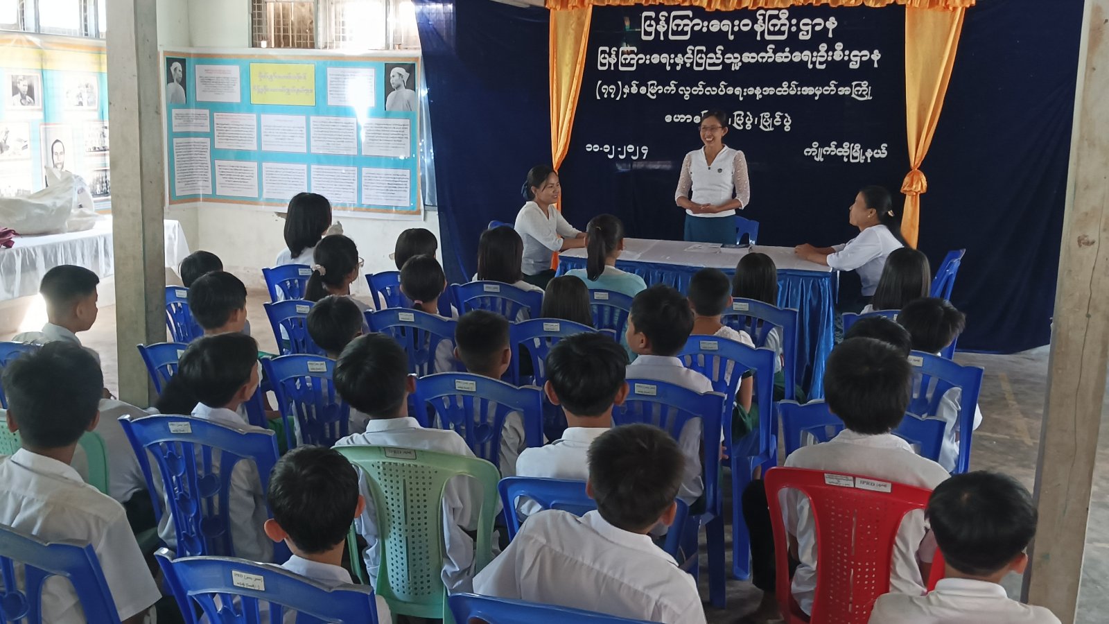 ထို့နောက် ပြန်ကြားရေးနှင့်ပြည်သူဆက်ဆံရေးဦးစီးဌာနမှ လွတ်လပ်ရေးရရှိအောင် ကြိုးပမ်းဆောင်ရွက်ခဲ့သည့် နံရံကပ်စာစောင်များ၊ မူးယစ်ဆေးဝါးအန္တရာယ်၊ လူကုန်ကူးမှုအန္တရာယ်၊ ကလေးသူငယ်စစ်မှုထမ်းခြင်းမှ ကာကွယ်ရေး၊ ယာဉ်စည်းကမ်း၊ လမ်းစည်းကမ်းအန္တရာယ် ကြိုတင်ကာကွယ်ရေး၊ ကလေးအလုပ်သမားပပျောက်ရေး နံရံကပ်စာစောင်များကိုပြသရာ တက်ရောက်လာသော ကျောင်းသား၊ ကျောင်းသူများမှ စိတ်ပါဝင်စားစွာ လေ့လာကြည့်ရှုကြကြောင်း သိရသည်။