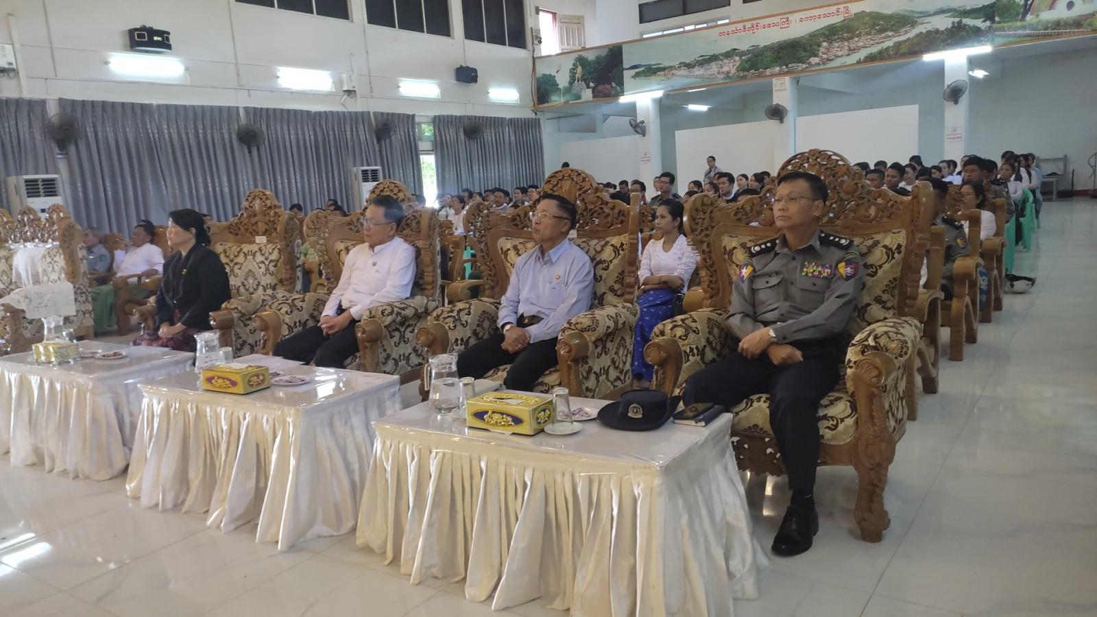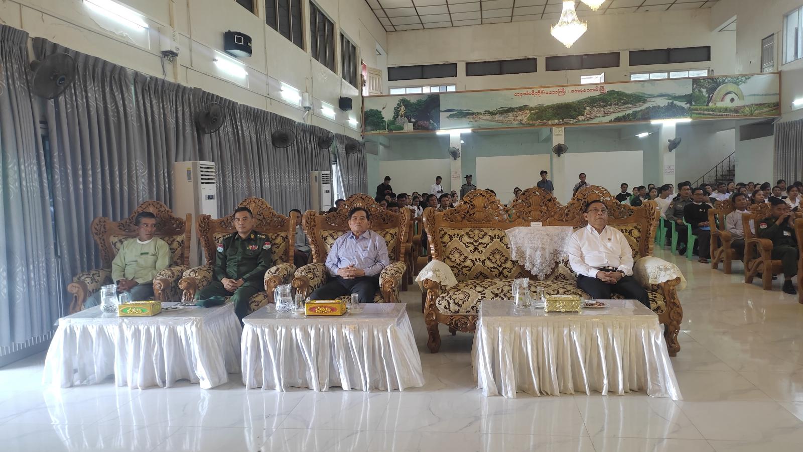 ဥပဒေရေးရာဝန်ကြီးဌာနနှင့် ပညာရေးဝန်ကြီးဌာနတို့ပူးပေါင်းကျင်းပသည့် (Grade 11) နှင့် (Grade 12) ဆရာများအတွက် ဥပဒေအသိပညာပြန့်ပွားရေး ဆရာဖြစ်သင်တန်း အမှတ်စဉ် (၄/၂၀၂၄) သင်တန်းဖွင့်ပွဲကို ယနေ့နံနက် ၉ နာရီခန့်က ကော့သောင်းမြို့၊ မဉ္ဇူသကခန်းမ၌ ကျင်းပရာ ဖွင့်ပွဲအခမ်းအနားသို့ တနင်္သာရီတိုင်းဒေသကြီးဝန်ကြီးချုပ်ဦးမြတ်ကို၊ တိုင်းဒေသကြီးတရားလွှတ်တော်တရားသူကြီးချုပ် ဒေါ်ပိုက်ပိုက်အေး၊ တိုင်းဒေသကြီးအစိုးရအဖွဲ့ဝင်ဝန်ကြီးများ၊ တိုင်းဒေသကြီးဥပဒေချုပ် ဦးအုန်းသန်းနှင့် တိုင်းဒေသကြီးမှ
