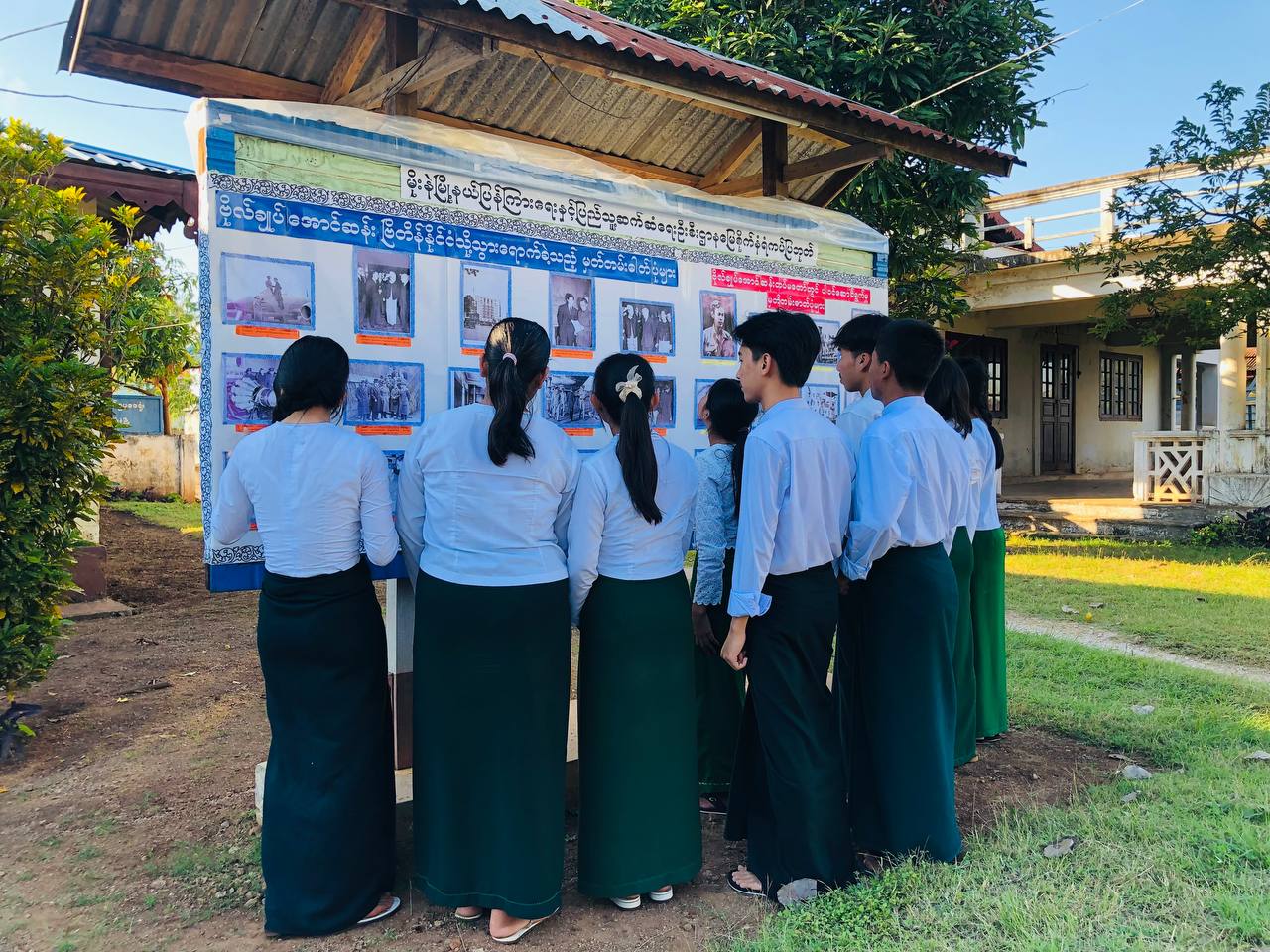 အဆိုပါ မြေစိုက်နံရံကပ်ပြဘုတ်တွင် လွတ်လပ်ရေးရရှိအောင် အားသွန်ခွန်စိုက် ကြိုးပမ်းဆောင်ရွက်ခဲ့သော အာဇာနည်ခေါင်းဆောင်ကြီး ဗိုလ်ချုပ်အောင်ဆန်း၏ ဗြိတိန်နိုင်ငံသို့သွားရောက်ခဲ့သည့် မှတ်တမ်းဓာတ်ပုံ၊ တပ်မတော်တွင် ပါဝင်ဆောင်ရွက်ဆောင်ရွက်ခဲ့သည့် မှတ်တမ်းဓာတ်ပုံများပါရှိသော နံရံကပ်စာစောင်ကို ပြသခဲ့ရာ ကျောင်းသား/သူလေးများက ကြည့်ရှုလေ့လာခဲ့ကြောင်းသိရသည်။ ထိုသို့ နံရံကပ်စာစောင် ပြသလိုက်ခြင်းကြောင်း ကြည့်ရှုခဲ့သောကျောင်းသား/သူလေးများ လမ်းသွားလမ်းလာ ပြည်သူများအနေဖြင့် တွေ့မြင်လိုက်ခြင်းကြောင့် မျိုးချစ်စိတ်ဓာတ်များ ရှင်သန်ထက်မြတ်လာခြင်း၊ အာဇာနည်ခေါင်းဆောင်ကြီးများကို ပြန်လည်သတိတရရှိနေစေခြင်း၊ နေ့ကြီးရက်ကြီးများကို ပြန်လည်အမှတ်ရနေစေခြင်း၊ စသည့်အကျိုးကျေးဇူးများ ရရှိမည်ဖြစ်သည်။