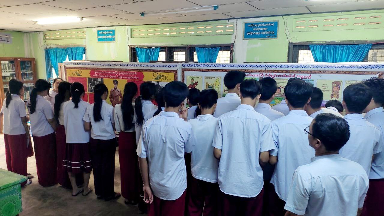 ယင်းနောက် ကျောင်းသား၊ ကျောင်းသူများက (၇၇)နှစ်မြောက် လွတ်လပ်ရေးနေ့အထိမ်းအမှတ် လွတ်လပ်ရေးကြိုးပမ်းဆောင်ရွက်မှု နံရံကပ်စာစောင်များ၊ဓာတ်ပုံများနှင့် စာအုပ်စာစောင်ပြပွဲများအား စိတ်ပါဝင်စားစွာ လေ့လာဖတ်ရှုခဲ့ကြကြောင်း သိရသည်။