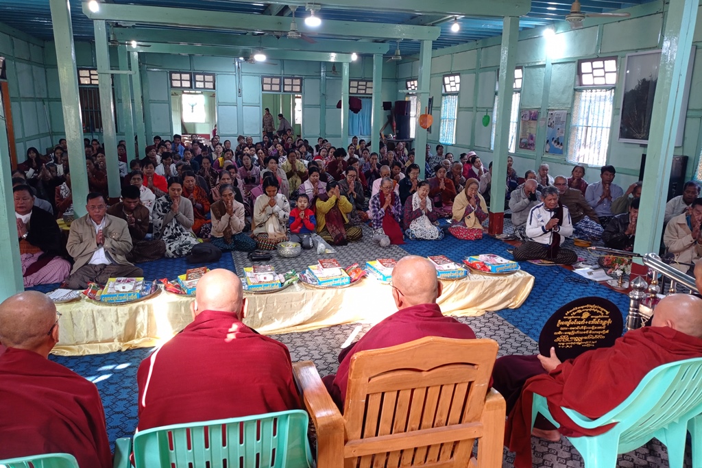 လှူဒါန်းရာတွင် ရှေးဦးစွာ နမောတဿဘုရားရှိခိုးဖြင့် အခမ်းအနားကို ဖွင့်လှစ်၍ မြို့နယ်သံဃနာယကဥက္ကဋ္ဌ၊ မြို့ခင်းသာပရိယတ္တိစာသင်တိုက်ဆရာတော် ဘဒ္ဒန္တဇဋိလထံမှ ရှစ်ပါးသီလကို ခံယူဆောက်တည်ကြပြီး ပင့်ဖိတ်ကြွလာသံဃာတော် အရှင်သူမြတ်များအား လှူဖွယ်ပစ္စည်းများ ဆက်ကပ်လှူဒါန်းကြကာ စိုင်ဒူးရွာအောင်မင်္လာကျောင်းတိုက်ဆရာတော် ဘဒ္ဒန္တဇောတိကထံမှ တရားတော်ကိုနာယူကြသည်။