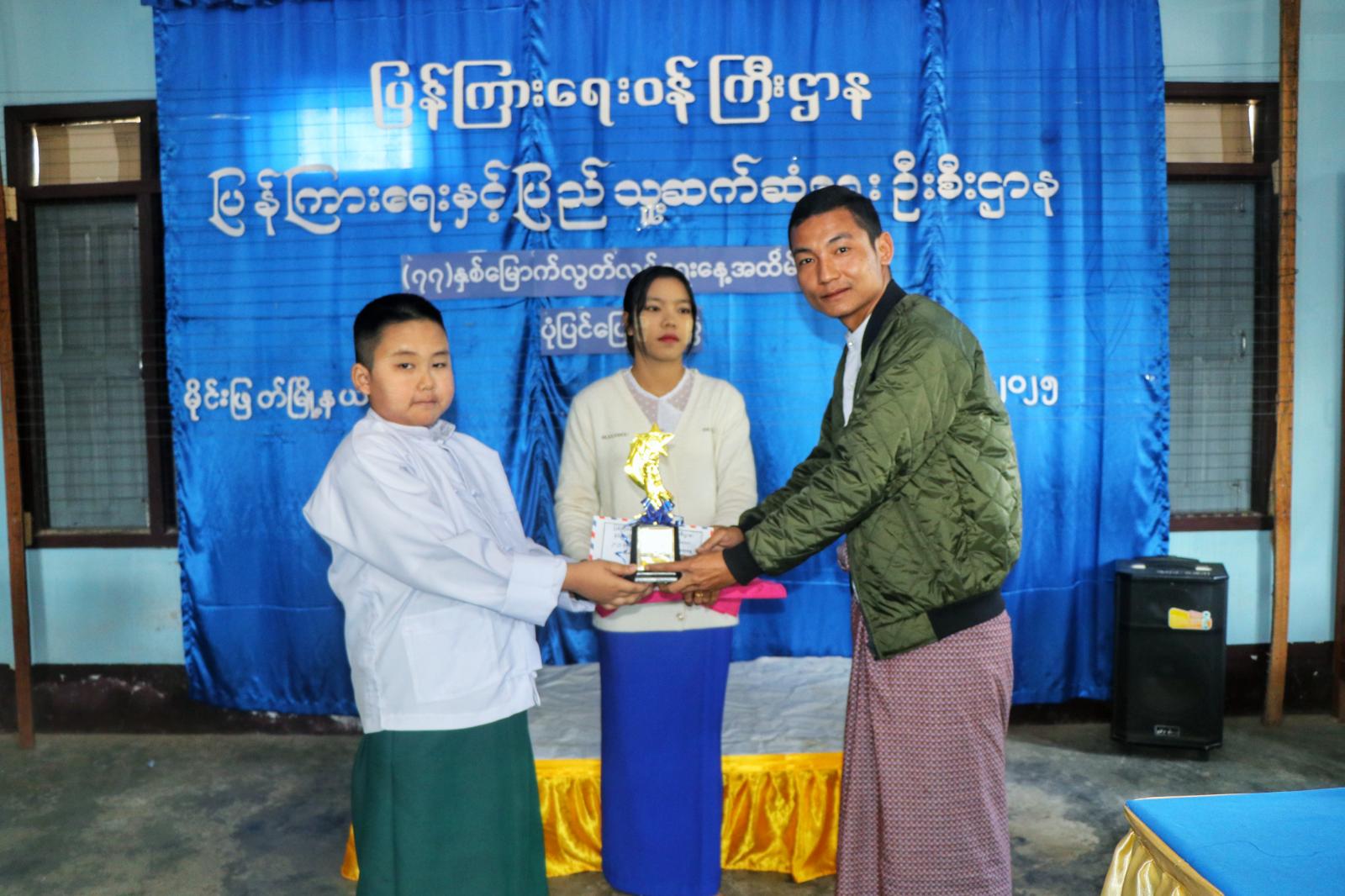 ဆက်လက်၍ ပြိုင်ပွဲအပြီးတွင် ဆုရရှိကြသည့် ကျောင်းသား၊ ကျောင်းသူများကို မြို့နယ်ပြန်ကြားရေးနှင့်ပြည်သူ့ဆက်ဆံရေးဦးစီးဌာနမှ ဦးစီးအရာရှိ ဒေါ်အေးဝင်းခိုင်နှင့် အမှတ်ပေးဒိုင်များက ဂုဏ်ပြုဆုများကို ပေးအပ်ချီးမြှင့်ခဲ့ပြီး ဝန်ထမ်းများက သတင်းစကားလက်ကမ်းစာစောင်များ ဖြန့်ဝေပေးခဲ့ကြောင်း သိရသည်။