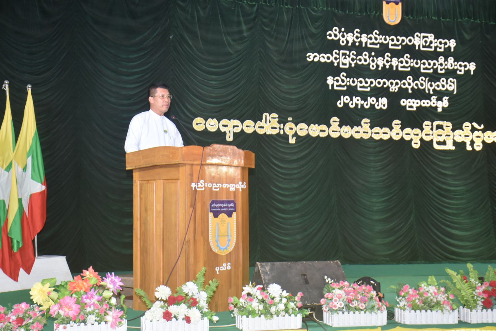 ဦးစွာနည်းပညာတက္ကသိုလ်(ပုသိမ်)၊ လျှပ်စစ်စွမ်းအားအင်ဂျင်နီယာဌာနနှင့် သုတနည်းပညာအင်ဂျင်နီယာဌာနတို့မှ ကျောင်းသား၊ ကျောင်းသူများက “ပြည်ထောင်စုကြီးတို့မြန်မာ”သီချင်းဖြင့် ကပြဖျော်ခဲ့ပြီးနောက် တိုင်းဒေသကြီးဝန်ကြီးချုပ်က “တိုင်းဒေသကြီးအတွင်းရှိ တက္ကသိုလ်၊ ဒီရီကောလိပ်၊ သိပ္ပံကျောင်းများတွင် မောင်မယ်သစ်လွင်ကြိုဆိုပွဲများကို ကျင်းပဆောင်ရွက် ခဲ့ပါကြောင်း၊ နည်းပညာတက္ကသိုလ်(ပုသိမ်)တွင် စတင်ပညာဆည်းပူးမည့် မောင်တို့မယ်တို့ကိုလည်း နွေးထွေးစွာကြိုဆိုပါကြောင်း၊ ခေတ်မီဖွံ့ဖြိုးတိုးတက်သော နိုင်ငံတော်ကို တည်ဆောက်ရာတွင် ပညာရေးဖြင့် ပုံဖော်တည်ဆောက်ရမည်ဖြစ်ပါကြောင်း၊ မိမိတို့၏ရည်မှန်းချက်ကို ပျက်ပြားစေမည့် အနှောင့်အယှက်၊ အဟန့်အတားများကို ရင်ဆိုင်ကျော်လွှား၍ ရည်မှန်းထားသည့် ပညာရပ် နယ်ပယ်ကို ပေါက်မြောက်အောင်မြင်အောင် ကြိုးစားသင်ယူကြရန် မှာကြားလိုပါကြောင်း၊ မောင်တို့ မယ်တို့အနေဖြင့် မိမိနိုင်ငံနှင့်တိုင်းဒေသကြီး၏ ဂုဏ်ကိုဆောင်နိုင်သော အသိပညာရှင်၊ အတတ်ပညာရှင်များဖြစ်အောင် ကြိုးစားကြရမည်ဖြစ်ပါကြောင်း၊ ဧရာဝတီတိုင်းဒေသကြီးသည် စိုက်ပျိုးရေးကို အဓိကလုပ်ဆောင်နေသော တိုင်းဒေသကြီးဖြစ်သဖြင့် စိုက်ပျိုးရေးလုပ်ငန်းများအတွက် အထောက်အကူဖြစ်စေသော နည်းပညာပိုင်းဆိုင်ရာ ဆန်းသစ်တီထွင်မှုများအား ကြိုးစားဆောင်ရွက်ကြစေလိုကြောင်းနှင့် အသေးစား၊ အငယ်စားနှင့် အလတ်စားစီးပွားရေးလုပ်ငန်းများ ဖွံ့ဖြိုးတိုးတက်ရေးအတွက် လိုအပ်သောနည်းပညာများကို ပံ့ပိုးပေးနိုင်အောင် ကြိုးစား ကြရမည်ဖြစ်ပါကြောင်း”နှုတ်ခွန်းဆက်အမှာစကားများပြောကြားပြီး နည်းပညာတက္ကသိုလ်(ပုသိမ်)အတွက် ဂုဏ်ပြုချီးမြှင့်ငွေများ ပေးအပ်ခဲ့ရာ ဒုတိယပါမောက္ခချုပ်က လက်ခံရယူခဲ့သည်။
