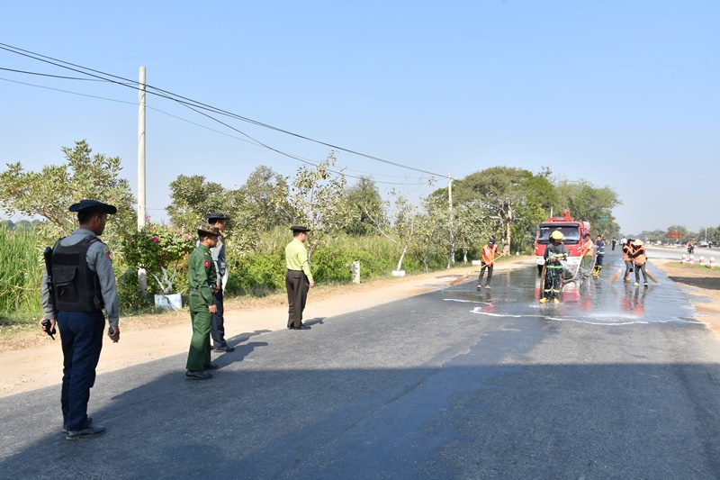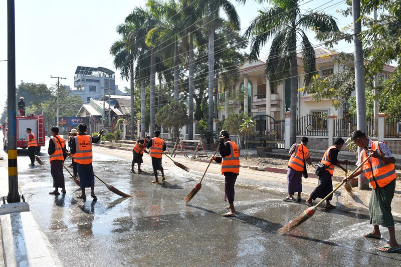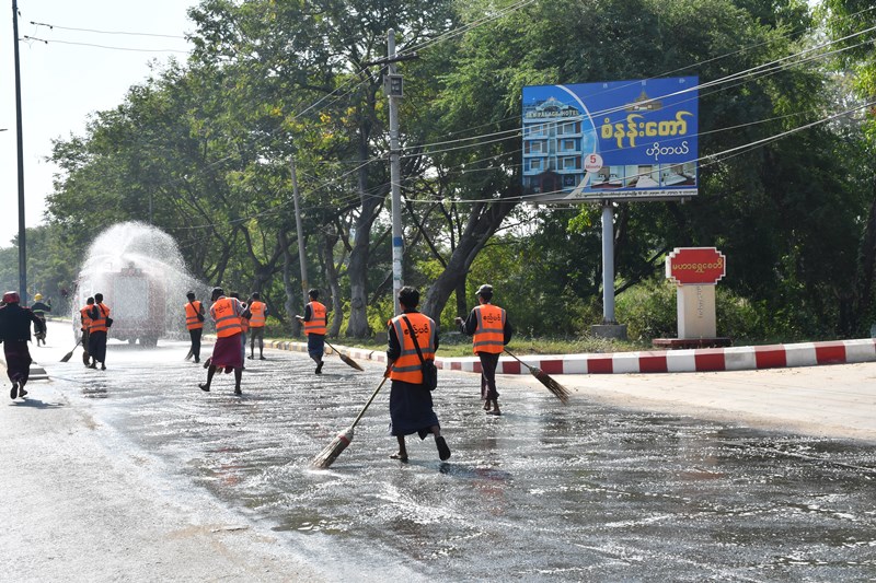 သန့်ရှင်းရေးလုပ်ငန်းများ ဆောင်ရွက်ရာတွင် ကျောက်ဆည်ခရိုင်စီမံအုပ်ချုပ်ရေးအဖွဲ့ဥက္ကဋ္ဌ ဦးကောင်းမြတ်နိုင် ဦးဆောင်၍ ကျောက်ဆည်မြို့နယ်စီမံအုပ်ချုပ်ရေးအဖွဲ့ဥက္ကဋ္ဌ ဦးဇော်လင်းထွန်း၊ အဖွဲ့ဝင်(၁) ဗိုလ်မှူးဇေယျာလှိုင်၊ မြို့နယ်အထွေထွေအုပ်ချုပ်ရေးဦးစီးဌာန၊ မြို့နယ်ရဲတပ်ဖွဲ့၊ မြို့နယ် စည်ပင်သာယာရေးအဖွဲ့၊ မြို့နယ်မီးသတ်ဦးစီးဌာနတို့မှ ဝန်ထမ်းများပူးပေါင်း၍ စုစုပေါင်းအင်အား (၆၀)ဦးဖြင့် မြို့ဝင်မြို့ထွက်နေရာမှစတင်ကာ ရန်ကုန်-မန္တလေးကားလမ်းမကြီးတစ်လျှောက် မြို့နယ်မီးသတ်ဦးစီးဌာနမှ မီးသတ်ရေယာဉ်(၂)စီးဖြင့် လမ်းမကြီးတစ်လျှောက်ရေပက်ဖြန်းခြင်းများ၊ တံမြတ်စည်းလှဲခြင်းများ ဆောင်ရွက်ခဲ့ကြောင်း သိရသည်။
