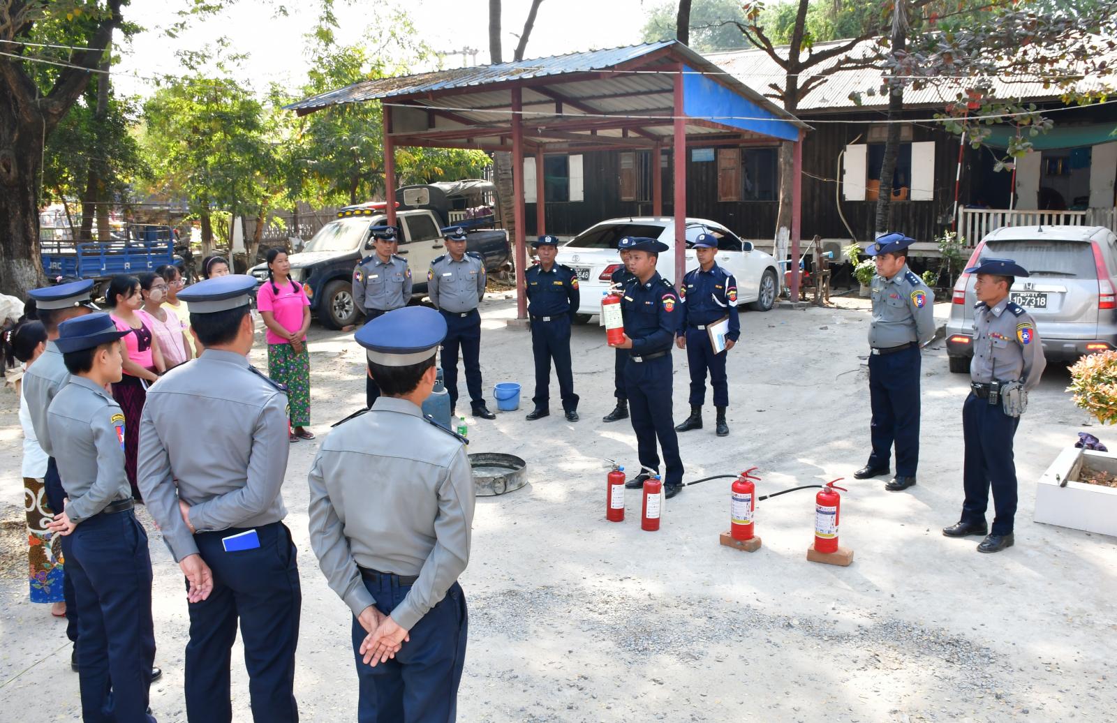 ဦးစွာ မီးသတ်တပ်ဖွဲ့ဝင်များက ဂက်(စ်)မီး၊ ဆီမီးတို့ကို လက်တွေ့ငြှိမ်းသတ်ခြင်းများ ပြသပေးခဲ့ပြီး၊ မြို့မရဲစခန်းရှိ အရာထမ်း၊ အမှုထမ်းများနှင့် တပ်ဖွဲ့ဝင် မိသားစုများအား လက်တွေ့ပါဝင်စမ်းသပ် မီးငြှိမ်းသတ်ခြင်းများ ဆောင်ရွက်စေခဲ့ပြီး၊ စခန်းအတွင်းရှိ နေအိမ်လိုင်းခန်းများ မီးဘေးအန္တရာယ် ကြိုတင်ကာကွယ်ရေးလုပ်ငန်းများ ဆောင်ရွက်ထားရှိမှုအား လှည့်လည်ကြည့်ရှု စစ်ဆေးခဲ့ပြီး၊ လိုအပ်သည်များ ဆောင်ရွက်ထားရှိရန် မှာကြားခဲ့သည်။