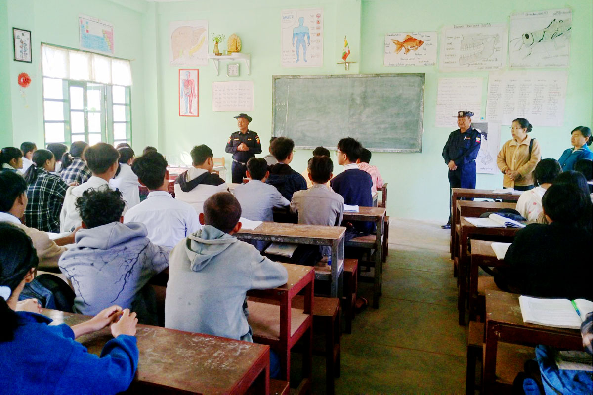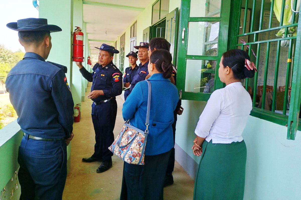ထိုသို့ဆောင်ရွက်ရာတွင် မီးသတ်ဦးစီးဌာန မြို့နယ်ဦးစီးမှူး ဦးသန်းမြင့်က သက်ဆိုင်ရာ ကျောင်းအုပ်ဆရာကြီး/ ဆရာမမကြီးများနှင့် ကျောင်းသား/ ကျောင်းသူများနှင့် တွေ့ဆုံ၍ ပွင့်လင်းရာသီကာလ ရောက်ရရှိလာပြီဖြစ်၍ အခြေခံပညာစာသင်ကျောင်းများ မီးလောင်မှု/မီးလန့်မှုမဖြစ်ပွားစေရေးနှင့် မီးဘေးလုံခြုံရေးတို့အတွက် ကျောင်းအခြေပြုစစ်ဆေးခြင်း အသိပညာပေးခြင်း ဆောင်ရွက်ရခြင်းဖြစ်ကြောင်းနှင့် မီးလောင်မှုမဖြစ်ပွားစေရေးအတွက် ကြိုတင်ကာကွယ်ရေး လုပ်ဆောင်ထားသင့်သည့်အချက်များ၊ မီးလောင်လွယ်ကူသည့် အမှိုက်သရိုက်များနှင့် ပစ္စည်းများကို ရှင်းလင်းဖယ်ရှားထားရေး၊ မီးဘေးလုံခြုံရေးအတွက် လိုအပ်သည့် ရေ/ သဲမှစ၍ အထောက်အကူပြု ပစ္စည်းများ စုံလင်အောင်ထားရှိရေးတို့ကို ဆွေးနွေးမှာကြားသည်။ ယင်းနောက် မြို့နယ်ဦးစီးမှူးနှင့် အဖွဲ့ဝင်များသည် ကျောင်းဆောင်များရှိ လျှပ်စစ်မီးကြိုးသွယ်တန်းထားရှိမှုများ၊ လျှပ်စစ်မိန်းခုံများနှင့် မီးဘေးကြိုတင်ကာကွယ်ရေး ပစ္စည်းများဖြစ်သည့် သဲ၊ ရေ၊ လှေကား၊ မီးသတ်ဆေးဗူးများ ဆောင်ရွက်ထားရှိမှုနှင့် ရေကန်များအတွင်း ရေလုံလောက်စွာ သိုလှောင်ထားရှိမှု အခြေအနေများကို ကြည့်ရှုစစ်ဆေး၍ အကြံပေးဆွေးနွေးခြင်းများ ဆောင်ရွက်ခဲ့ကြသည်။