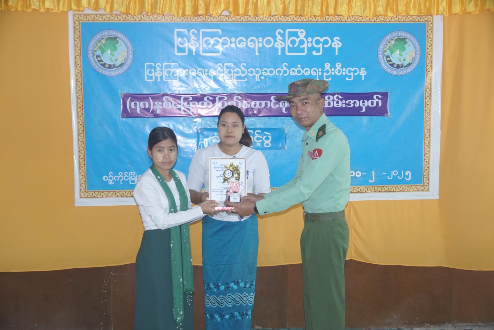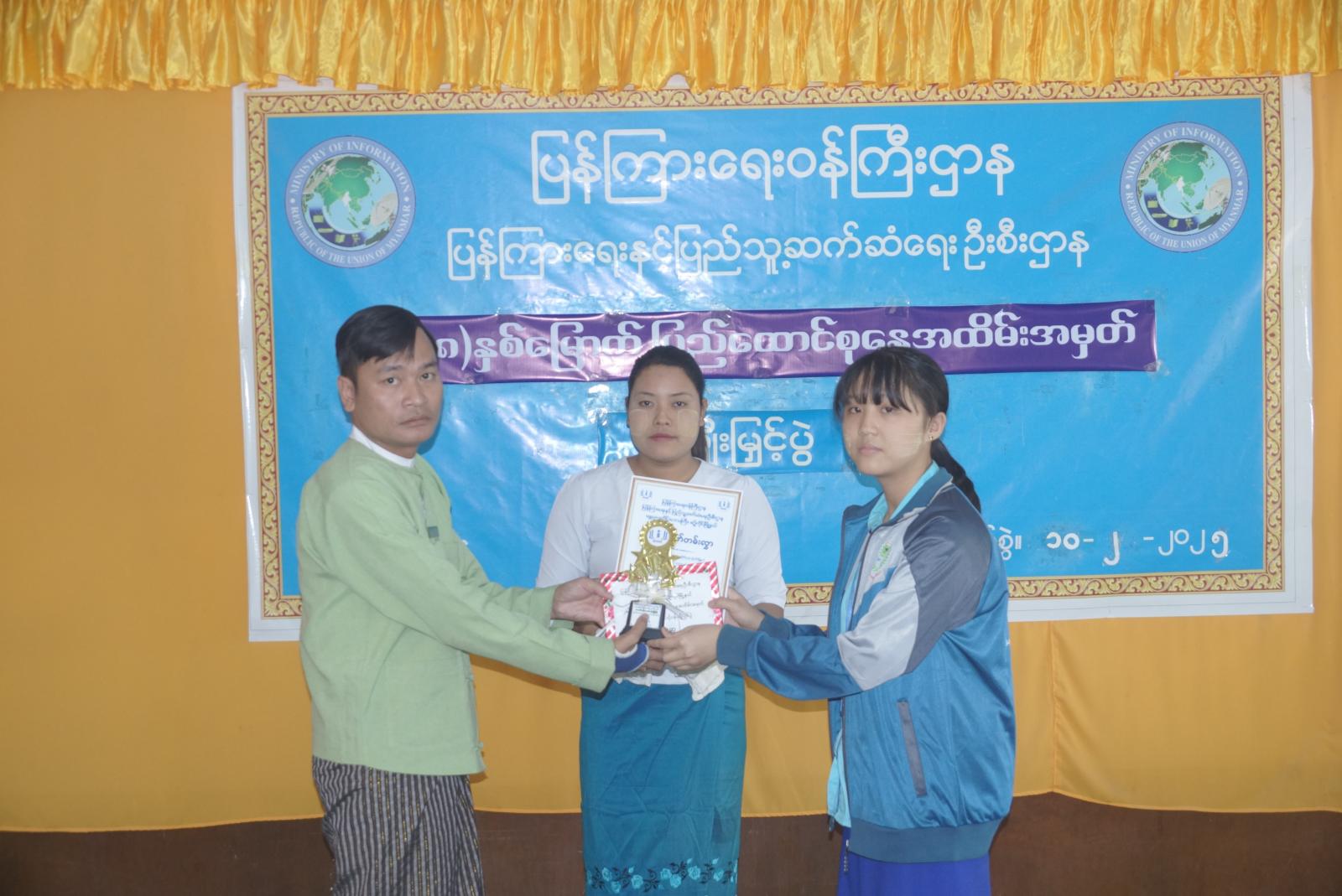 ၎င်းနောက် မြို့နယ်စီမံအုပ်ချုပ်ရေးအဖွဲ့ အဖွဲ့ဝင်(၁)ဗိုလ်မှူးပြည့်ဖြိုးအောင်၊ မြို့နယ်အထွေထွေအုပ်ချုပ်ရေးဦးစီးဌာနမှ ဒုတိယမြို့နယ်အုပ်ချုပ်ရေးမှူး ဦးကျော်ကျော်လင်းနှင့် တာဝန်ရှိသူများက (၇၈)နှစ်မြောက် ပြည်ထောင်စုနေ့ အထိမ်းအမှတ်(အကြို) ပြိုင်ပွဲများတွင် ဆုရရှိသော ကျောင်းသား၊ ကျောင်းသူများအား ဆုများအသီးသီး ချီးမြှင့်ပေးအပ်ခဲ့ကြောင်းနှင့် အခမ်းအနားအပြီးတွင် တက်ရောက်လာကြသူများက ရုံးဝန်းအတွင်းပြသထားသေယ သုတ/ရသ စုံလင်သည့် စာအုပ်စာစောင်များနှင့် အသိပညာပေးနံရံကပ်စာစောင်များကို စိတ်ပါဝင်စားစွာ လှည့်လည်ကြည့်ရှုခဲ့ကြောင်း သိရသည်။