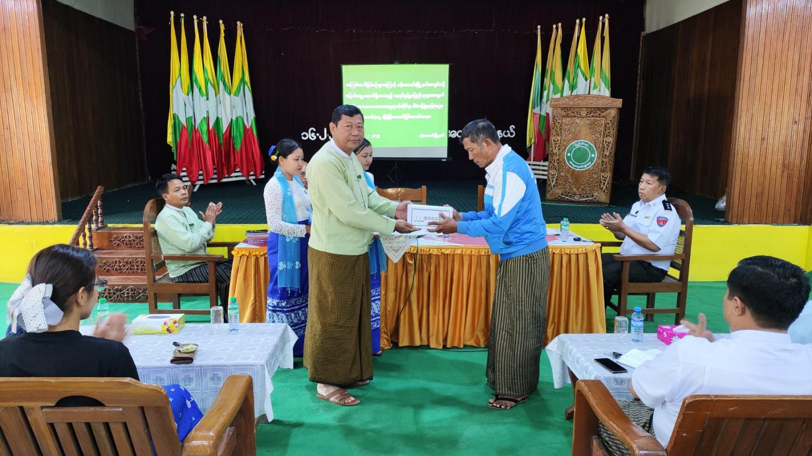 ထို့နောက် မြို့နယ်စီမံအုပ်ချုပ်ရေးအဖွဲ့ဥက္ကဋ္ဌ ဦးအောင်သူရနှင့်အဖွဲ့ဝင်များ၊ အမျိုးသား သဘာဝဘေးအန္တရာယ်ဆိုင်ရာစီမံခန့်ခွဲမှုဦးစီးဌာန လက်ထောက်ညွှန်ကြားရေးမှူး ဦးရာဇာဝင်းထွန်း၊ ဒုတိယမြို့နယ်အုပ်ချုပ်ရေးမှူး ဦးချစ်ကိုကိုတို့က ယာယီနေရပ်စွန့်ခွာပြည်သူတစ်ဦးလျှင် ဆန်ရိက္ခာဖိုးငွေ (၂၀,၀၀၀) ကျပ်နှုန်းဖြင့် စုစုပေါင်းပြည်သူ (၁၁၁၀)ဦးအတွက် စုစုပေါင်းငွေကျပ် (၂၂,၂၀၀,၀၀၀/-)သိန်းကို ပေးအပ်ရာ ယာယီနေရပ်စွန့်ခွာပြည်သူများကိုယ်စား ရပ်/ကျေးအုပ်ချုပ်ရေးမှူးများက လက်ခံခဲ့ပြီး ပြည်သူများထံ လက်ဝယ်အရောက် ပေးအပ်ခဲ့ကြောင်း သိရသည်။
