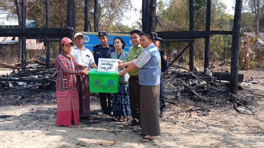 မီးဘေးသင့်မှုကြောင့် မီးလောင်ဆုံးရှုံးခဲ့သည့် နေအိမ်တစ်လုံးအတွက် အိမ်ဆောက်ပစ္စည်းဖိုးငွေ (၁၀၀၀၀၀) ကျပ်၊ အိမ်ထောင်စုတစ်စုရှိ လူဦးရေ (၂) ဦးအတွက် ဆန်ရိက္ခာ (၇) ရက်စာဖိုးငွေ (၄၂၀၀) ကျပ် စုစုပေါင်းငွေ (၁၀၄၂၀၀) ကျပ်နှင့် ကယ်ဆယ်ရေးပစ္စည်း (၁၆) မျိုးတို့ကို မြို့နယ်စီမံအုပ်ချုပ်ရေးအဖွဲ့ဥက္ကဋ္ဌ ဦးဖြိုးဝေလင်းနှင့် မြို့နယ်သဘာဝဘေးအန္တရာယ်ဆိုင်ရာ စီမံခန့်ခွဲမှုအဖွဲ့ဝင်များ၊ ဘေးအန္တရာယ်ဆိုင်ရာ စီမံခန့်ခွဲမှုဦးစီးဌာနမှ တာဝန်ရှိသူများက မီးဘေးသင့်ပြည်သူများထံ လက်ဝယ်အရောက် ပေးအပ်ခဲ့ကြောင်း သိရသည်။