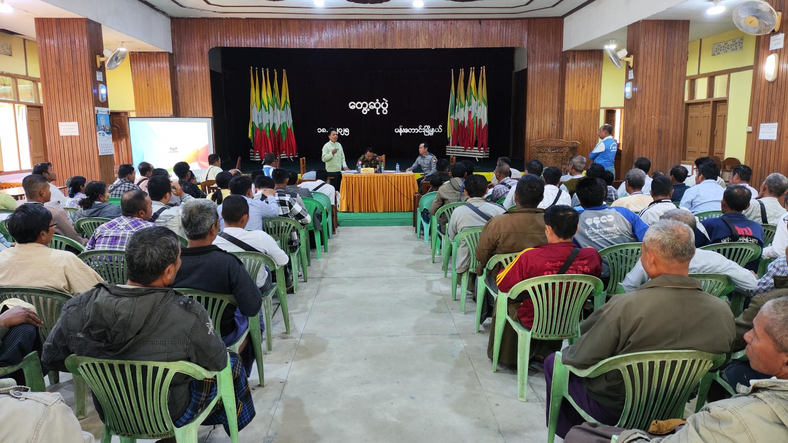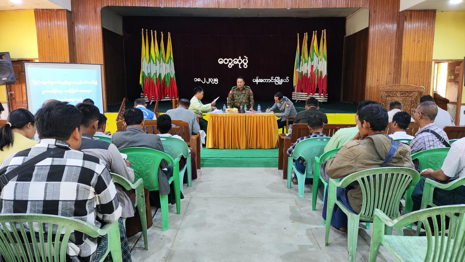 ပဲခူးတိုင်းဒေသကြီး၊ ပြည်ခရိုင်၊ ပန်းတောင်းမြို့နယ်၌ ပြည်သူ့စစ်မှုထမ်းနည်းဥပဒေနှင့်ပတ်သက်၍ ဥပဒေဆိုင်ရာအကြောင်းအရာများ ရှင်းလင်းဆွေးနွေးပွဲကို ယမန်နေ့နံနက် (၁၀) နာရီအချိန်က အထွေထွေအုပ်ချုပ်ရေးဦးစီးဌာန အစည်းအဝေးခန်းမတွင် ကျင်းပခဲ့ရာ မြို့နယ်ပြည်သူ့စစ်မှုထမ်းဆင့်ခေါ်ရေးအဖွဲ့အတွင်းရေးမှူး ဒုတိယမြို့နယ်အုပ်ချုပ်ရေးမှူး ဦးချစ်ကိုကိုနှင့်အဖွဲ့ဝင်များ၊ ဌာနဆိုင်ရာတာဝန်ရှိသူများ၊ ရပ်/ကျေးအုပ်ချုပ်ရေးမှူးများ၊ ရပ်မိရပ်ဖများ၊ စာရေးဝန်ထမ်းများ တက်ရောက်ခဲ့ကြသည်။