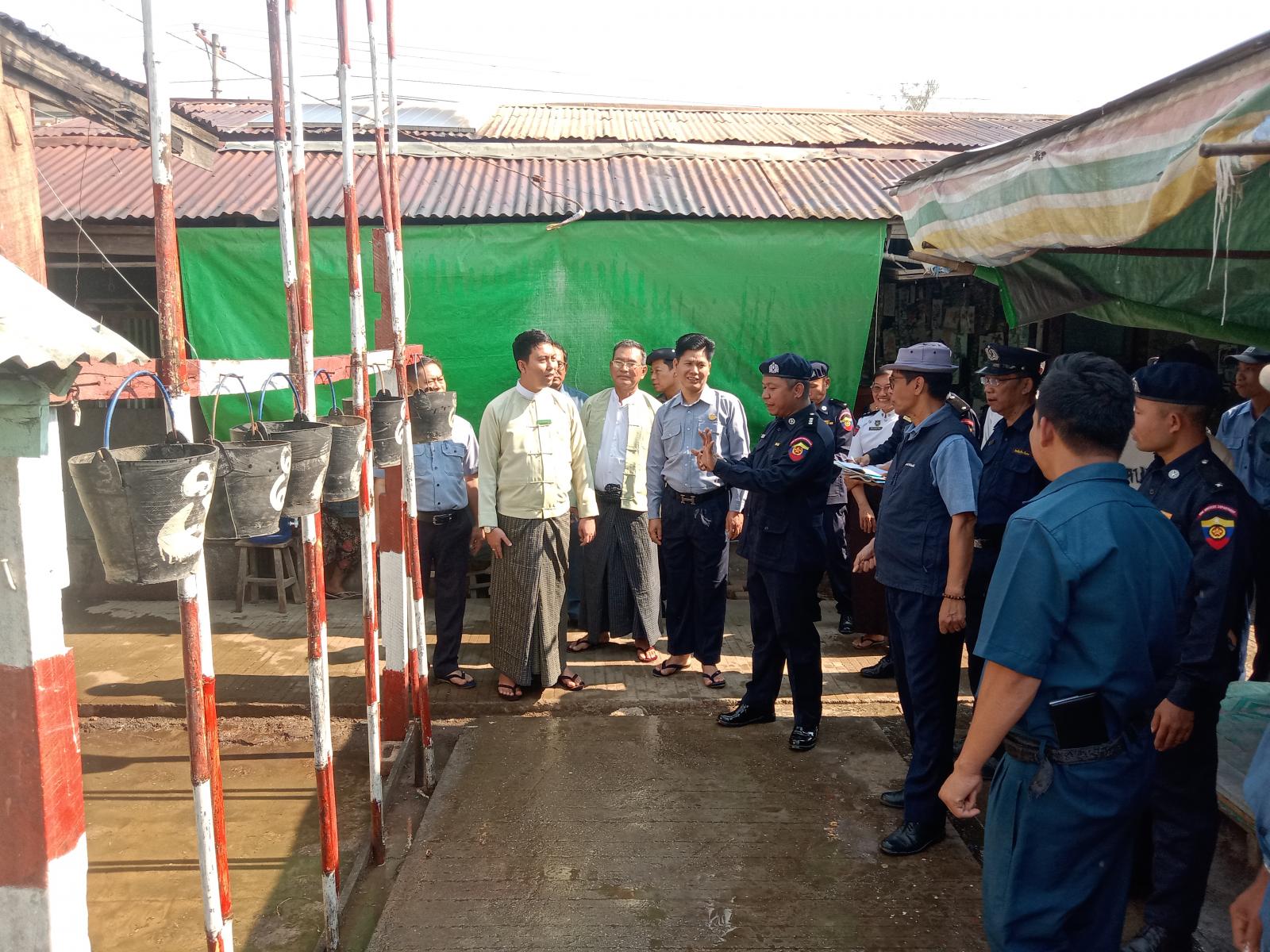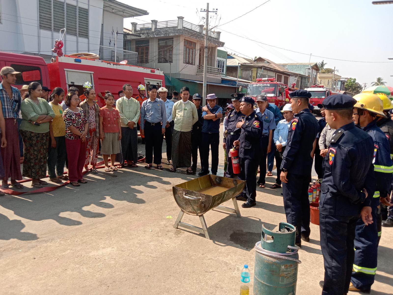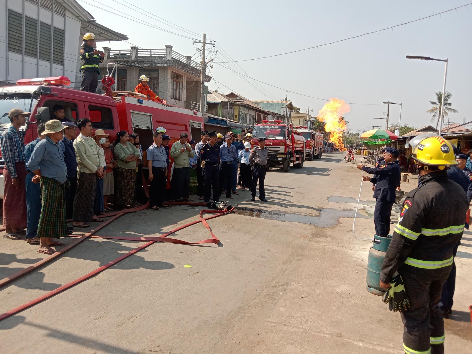 အဆိုပါသရုပ်ပြဇာတ်တိုက်လေ့ကျင့်ခြင်းကို မြို့နယ်မီးသတ်ဦးစီးမှူး ဦးတင်ဦးလတ် ဦးဆောင်သော တပ်ဖွဲ့ဝင်များ၊ မြို့နယ်စည်ပင်သာယာရေး အဖွဲ့ဝန်ထမ်းများ၊ စျေးကော်မတီဝင်များပူးပေါင်း၍ စျေးသူ၊စျေးသားများအား မီးသတ်ဆေးဘူး အသုံးပြုပုံ၊ ဆီမီးလောင်မှုအား မီးသတ်ဆေးဘူးအသုံးပြု၍ မီးငြှိမ်းသတ်နည်း၊ ရေစိုအဝတ်ဖြင့် ဖုံးအုပ်ငြှိမ်းသတ်နည်းများ၊ ဂက်စ် မီးလောင်မှုအားငြိမ်းသတ်နည်းများဖြင့် တက်ရောက်လာသော ဌာနဆိုင်ရာ၀န်ထမ်းများ၊ မြို့နယ်စည်ပင်သာယာရေးအဖွဲ့ဝန်ထမ်းများ၊ ဈေးကော်မတီဝင်များ၊ ဈေးသူဈေးသားများနှင့်အတူ ဇာတ်တိုက်လေ့ကျင့်ခဲ့ကြသည်။