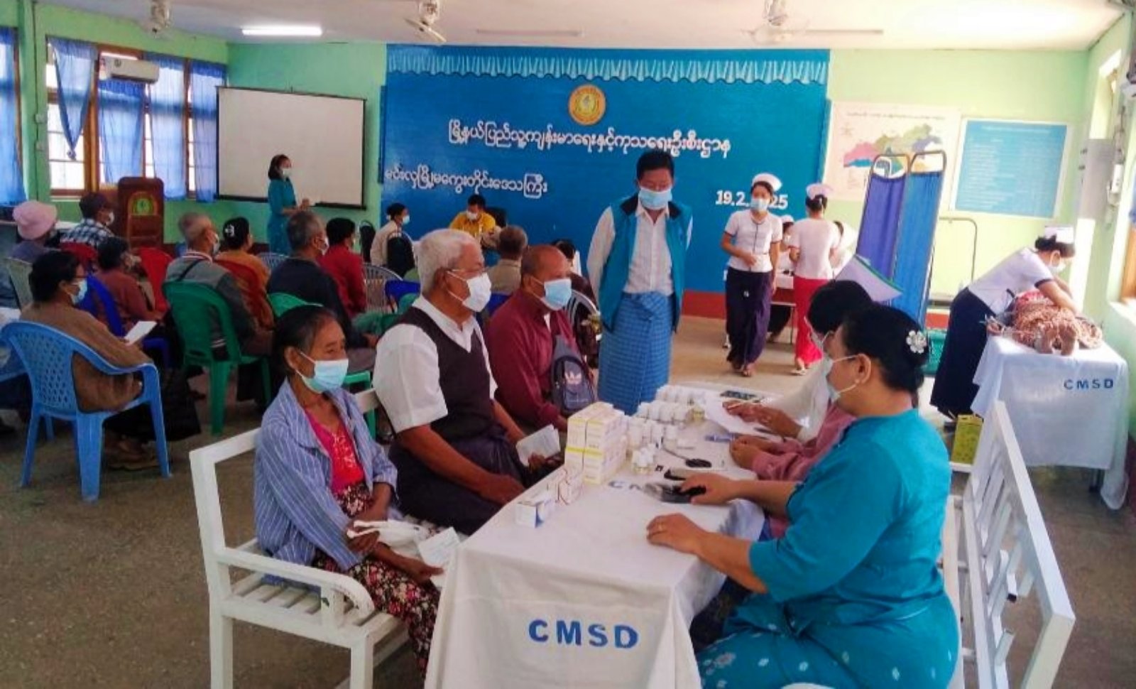 အဆိုပါ ကျန်းမာရေးစစ်ဆေးခြင်းနှင့်ဆေးကုသပေးရာတွင် မြို့နယ်ပြည်သူ့ကျန်းမာရေးဦးစီးဌာနမှ လက်ထောက်ဆရာဝန် ဒေါက်တာဝီရအောင်နှင့် ကျန်းမာရေးဝန်ထမ်းများက အငြိမ်းစားဝန်ထမ်များအား စာရင်းပေးသွင်းပြီး သွေးပေါင်ချိန်တိုင်းတာခြင်း၊ ဆီးချို၊ သွေးချိုစစ်ဆေးပေးခြင်း၊ နှလုံးစစ်ဆေးပေးခြင်းနှင့် လိုအပ်သည့်ဆေးဝါးများအား အခမဲ့ဆောင်ရွက်ပေးခဲ့ကြောင်း မြို့နယ်ပြည်သူ့ကျန်းမာရေးနှင့်ကုသရေးဦးစီးဌာနမှ သိရသည်။