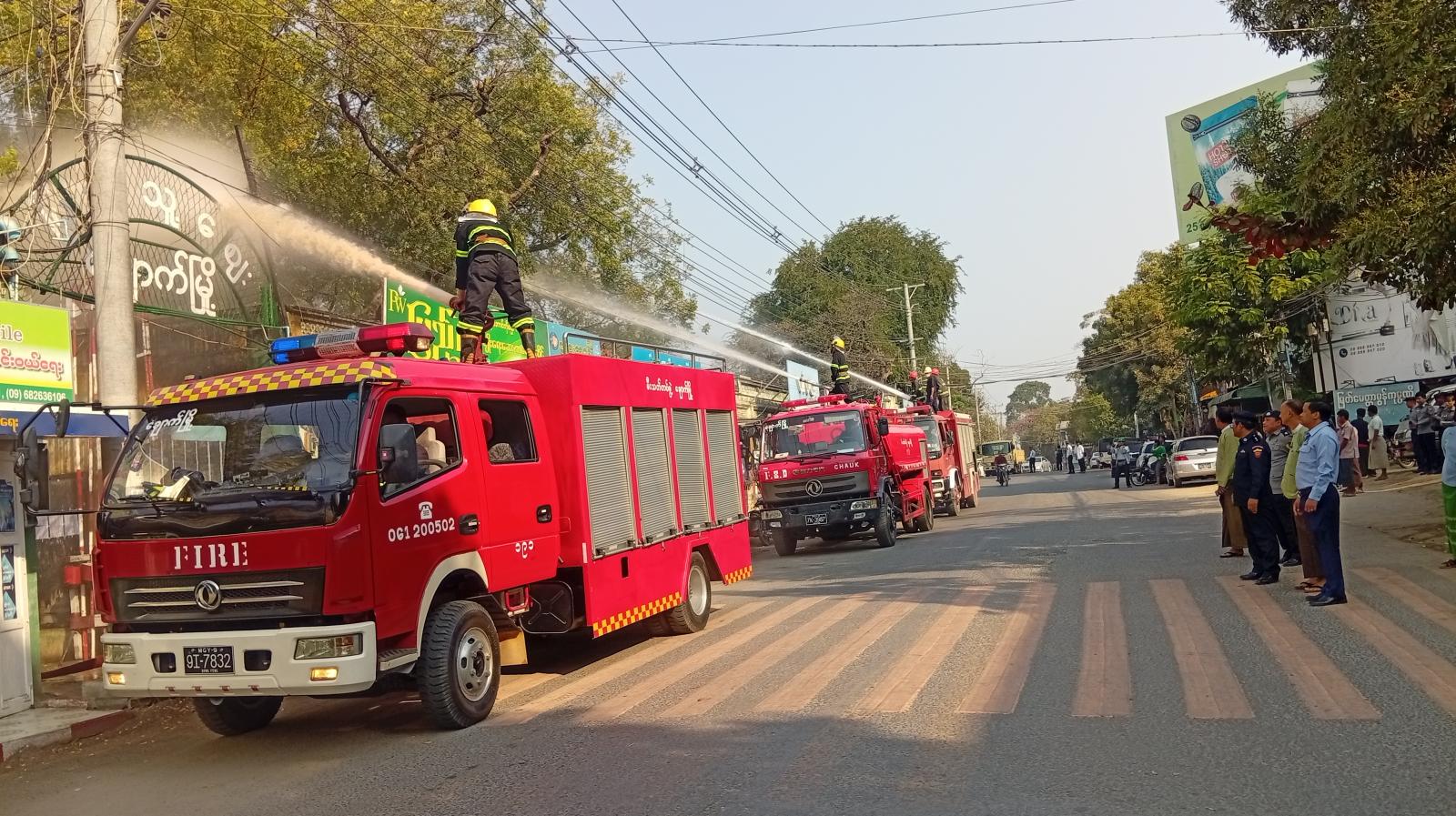 ထိုသို့ မီးငြှိမ်းသတ်ရေး ဇာတ်တိုက်လေ့ကျင့်ခြင်းကို မြို့နယ်မီးသတ်ဦးစီးဌာနမှ တပ်ဖွဲ့ဝင်များ၊ ရေနံမီးသတ်နှင့် မြို့နယ်စည်ပင်သာယာရေးအဖွဲ့ဝန်ထမ်းများ ပူးပေါင်းဆောင်ရွက်ခဲ့ခြင်းဖြစ်ပြီး အဆိုပါဇာတ်တိုက်လေ့ကျင့်ဆောင်ရွက်နေမှုကို ခရိုင်စီမံအုပ်ချုပ်ရေးအဖွဲ့ဥက္ကဋ္ဌ ဦးမိုးဇော်နိုင်၊ မြို့နယ်စီမံအုပ်ချုပ်ရေးအဖွဲ့ဥက္ကဋ္ဌ ဦးစိုးလွင်၊ ဌာနဆိုင်ရာများ၊ မြန်မာနိုင်ငံရဲတပ်ဖွဲ့ဝင်များ၊ မြို့နယ်ကြက်ခြေနီသူနာပြုတပ်ဖွဲ့ဝင်များ၊ လူမှုရေးအသင်းအဖွဲ့များ တက်ရောက်ကြည့်ရှုအားပေးခဲ့ကြောင်း သိရသည်။