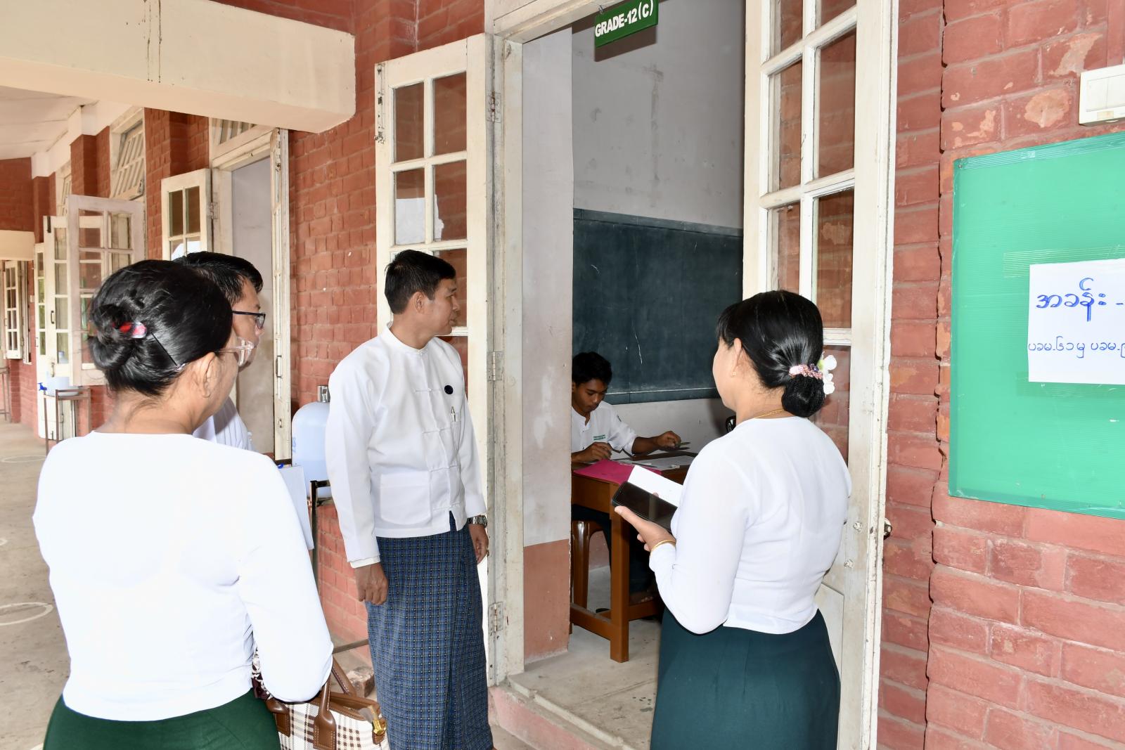 ဦးစွာ ပဲခူးတိုင်းဒေသကြီးအစိုးရအဖွဲ့ လူမှုရေးရာဝန်ကြီး ဦးမျိုးအောင်သည်၊ တိုင်းပညာရေးမှူး၊ ခရိုင်ပညာရေးမှူး၊ တာဝန်ရှိသူများနှင့်အတူ ပဲခူးမြို့ အမှတ်(၁)အခြေခံပညာအထက်တန်းကျောင်းသို့သွားရောက်၍ မြန်မာစာဘာသာရပ်အား ဖြေဆိုနေကြသည့် ကျောင်းသား၊ ကျောင်းသူများအား လိုက်လံကြည့်ရှုအားပေးခဲ့ပြီး စိတ်အေးချမ်းစွာဖြေဆိုနိုင်ရေး တာဝန်ရှိသူများအား လမ်းညွှန်မှာကြားခဲ့သည်။