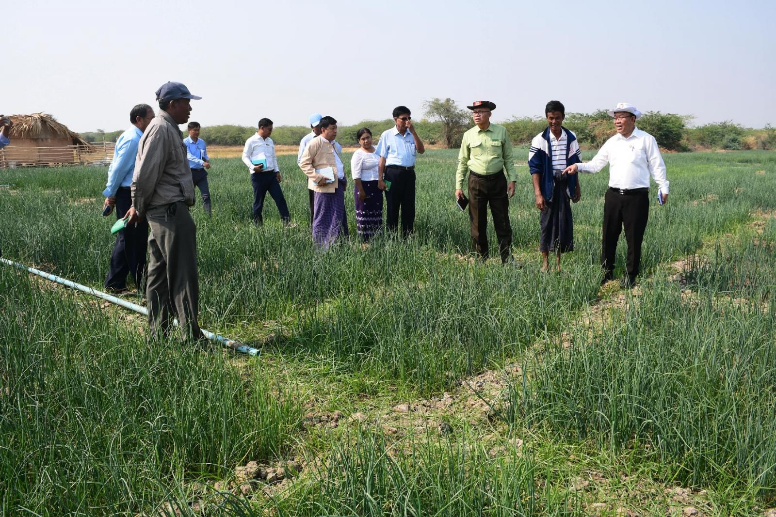 ဆက်လက်၍ ဝန်ကြီးနှင့်အဖွဲ့ဝင်များသည် ကဖြူကျေးရွာအုပ်စု မင်းတဲကုန်းကျေးရွာတွင် ကြက်သွန်နီ ၄၀ ဧက စိုက်ပျိုးသည့် ဒေသခံတောင်သူများနှင့်တွေ့ဆုံပြီး စိုက်ပျိုးသီးနှံများ ပန်းတိုင်အထွက်နှုန်း ထွက်ရှိရေးအတွက်လိုအပ်သည်များကို ပေါင်းစပ်ညှိနှိုင်းဆွေးနွေး ပြောကြားခဲ့ပြီး နိုင်ငံစီးပွားမြှင့်တင်ရေးရန်ပုံငွေဖြင့် ဆိုလာစနစ်နှင့် စက်ရေတွင်းမှတဆင့် ရေသွင်းစိုက်ပျိုးလျက်ရှိသော ဒေသခံတောင်သူဦးအောင်မြင့်၏ ကြက်သွန်နီစိုက်ခင်းအား ကြည့်ရှုအားပေးသည်။