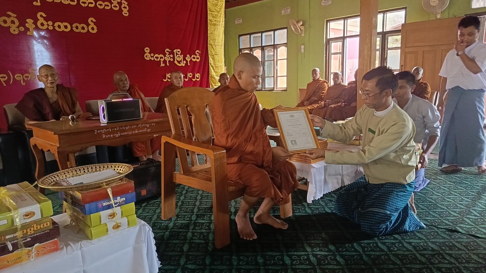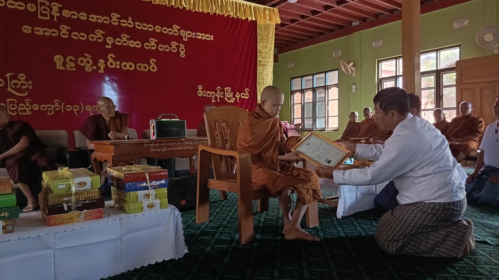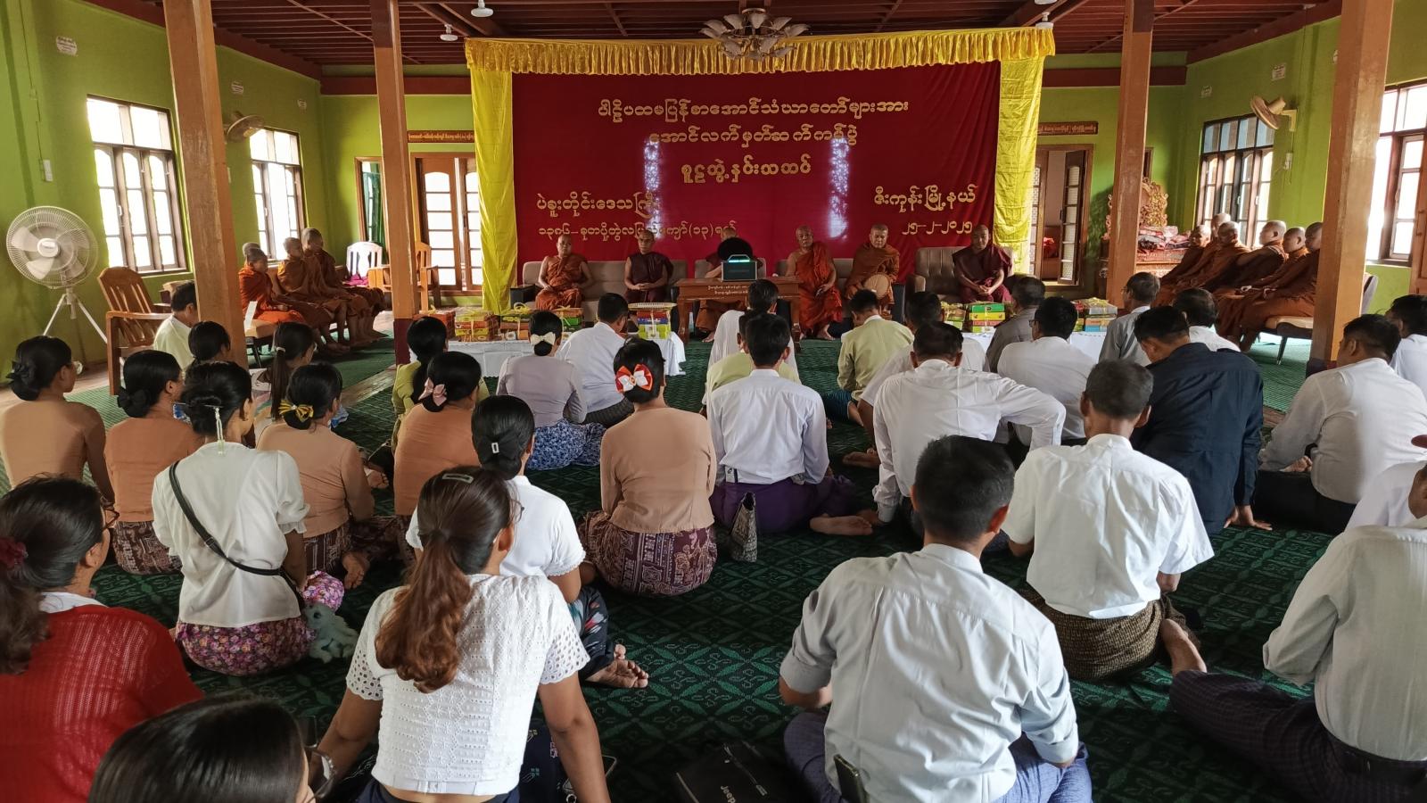 အခမ်းအနားအား နမောတဿ (၃) ကြိမ်ရွတ်ဆိုဖွင့်လှစ်ခဲ့ပြီး၊ နိုင်ငံတော်ဗဟိုဝန်ဆောင် အဂ္ဂမဟာဂန္ဓဝါစကပဏ္ဍိတ သမားတော်ကျောင်းတိုက်ဆရာတော် ဘဒ္ဒန္တတေဇဝန္တထံမှ ငါးပါးသီလခံယူဆောက်တည်ခဲ့ကြပြီး၊ ဆရာတော်ထံမှ ဩဝါဒစကားခံယူခဲ့ကြသည်။ ထိုနောက် မြို့နယ်စီမံအုပ်ချုပ်ရေးအဖွဲ့ဥက္ကဋ္ဌ ဦးမျိုးသက်အောင်မှ သာသနာရေးဆိုင်ရာကိစ္စရပ်များအား လျှောက်တင်ခဲ့သည်။ ဆက်လက်၍ သာသနာရေးနှင့် ယဉ်ကျေးမှုဝန်ကြီးဌာန၊ သာသနာရေးဦးစီးဌာနမှ ကျင်းပပြုလုပ်ခဲ့သော ပါဠိပထမပြန်စာမေးပွဲ၌ အောင်မြင်ခဲ့သော ပထမငယ်အောင် သံဃာ (၂) ပါး၊ အခြေပြုမူလတန်းအောင် (၉) ပါးတို့အား မြို့နယ်စီမံအုပ်ချုပ်ရေးအဖွဲ့ဥက္ကဋ္ဌ ဦးမျိုးသက်အောင်နှင့် တာဝန်ရှိသူများက အောင်လက်မှတ်နှင့် လှူဖွယ်ဝတ္ထုများကို ဆက်ကပ်လှူဒါန်းပေးခဲ့ပြီး အခမ်းအနားအား ဗုဒ္ဓသာသနံ စိရံတိဌတု (၃) ကြိမ်ရွတ်ဆို၍ အခမ်းအနားရုတ်သိမ်းခဲ့ကြောင်း သိရသည်။