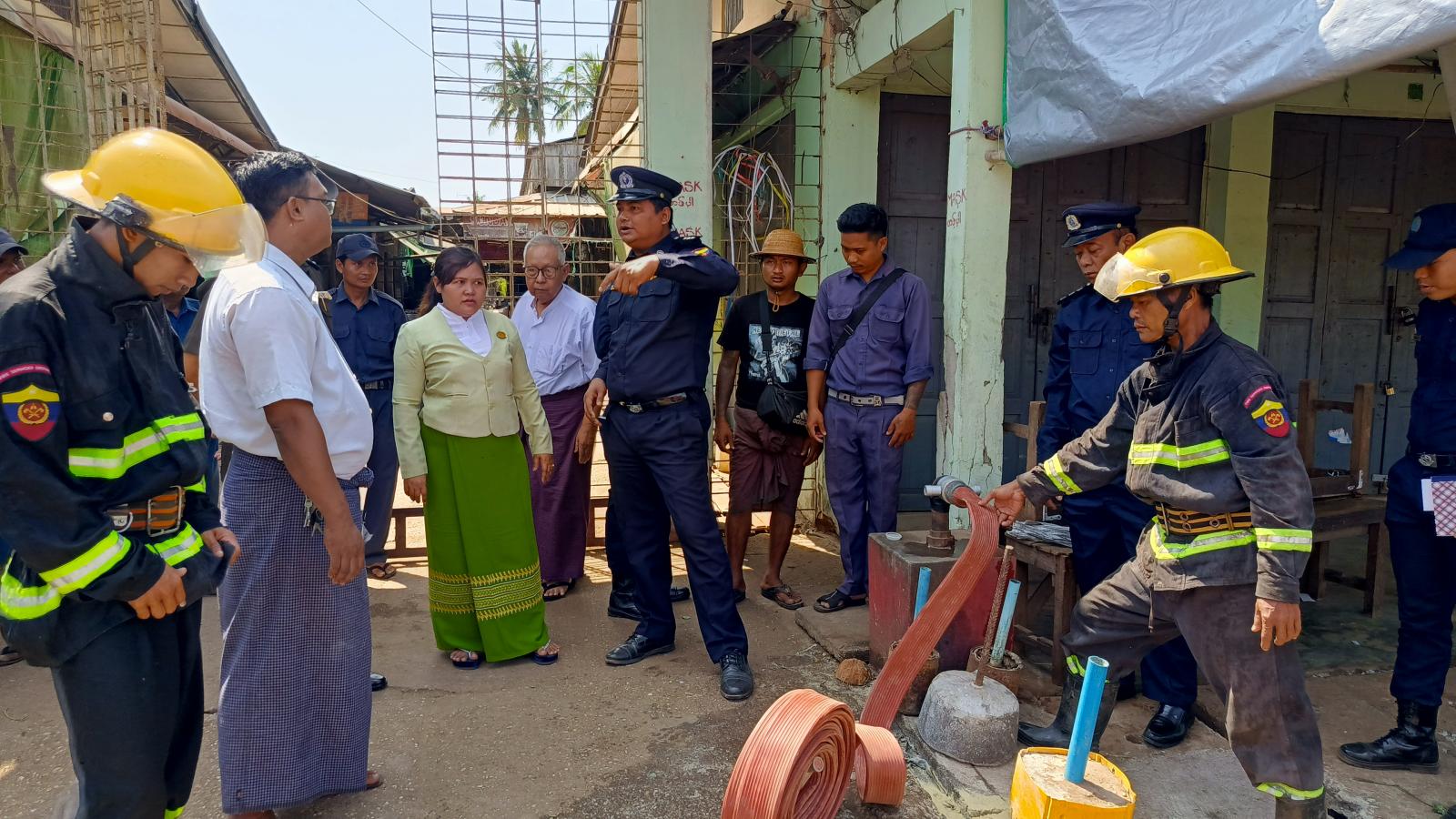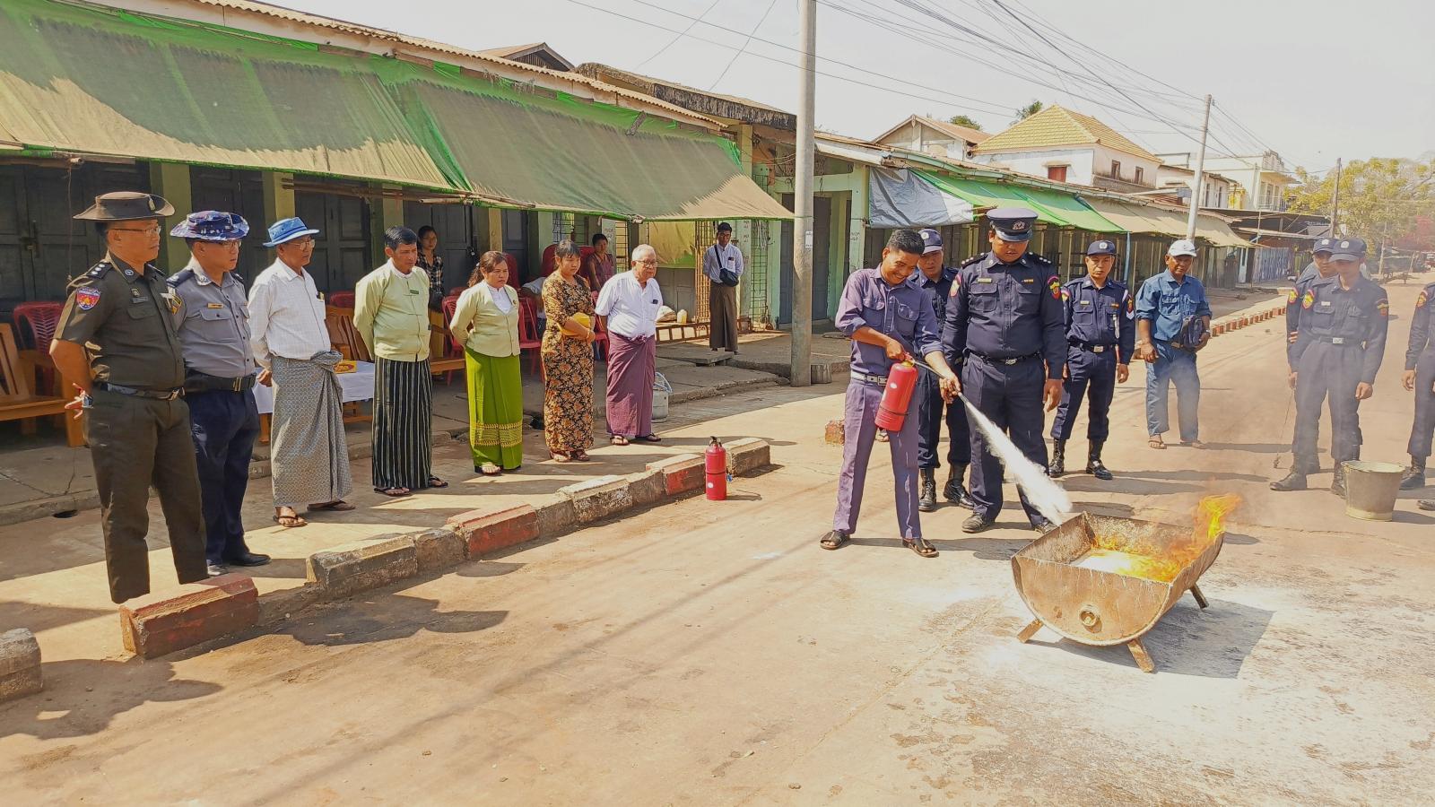 မီးဘေးကာကွယ်ရေးသရုပ်ပြလေ့ကျင့်ခြင်းကို မြို့နယ်မီးသတ်ဦးစီးမှူးဦးဝင်းနိုင်ဦးနှင့် မီးသတ်တပ်ဖွဲ့ဝင်များ၊ မြို့နယ်အရန်မီးသတ်တာဝန်ခံဦးစိန်ဝင်းတို့ပူးပေါင်းကာ မြို့မဈေးကြီးတွင် မီးဘေးကြိုတင်ကာကွယ်ရေးအတွက် မီးသတ်ကားများဖြင့် သရုပ်ပြရေဖြန်းမီးငြှိမ်းသတ်ခြင်း၊ မီးသတ်ဆေးဗူးလက်တွေ့အသုံးပြုပြသခြင်း၊ ဂက်(စ်)မီးငြှိမ်းသတ်နည်းတို့ကို သရုပ်ပြဇာတ်တိုက်လေ့ကျင့်ခဲ့သည်။