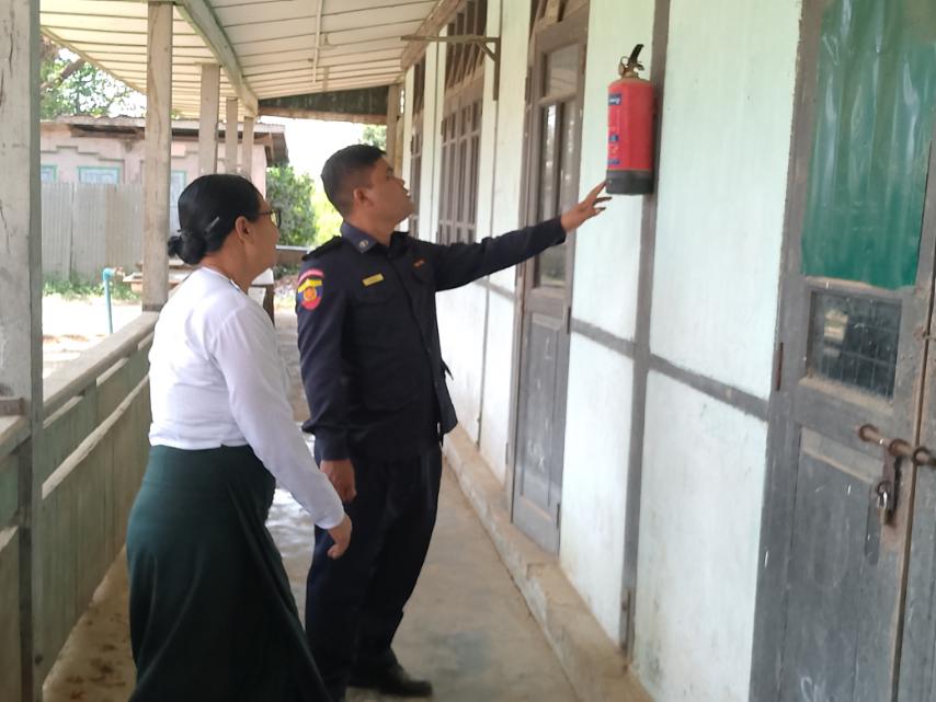 ထို့နောက် မြို့နယ်မီးသတ်ဦးစီးမှူးနှင့် မီးသတ်တပ်ဖွဲ့ဝင်များက အခြေခံပညာအထက်တန်းကျောင်းရှိ စာသင်ခန်းများတွင် တပ်ဆင်အသုံးပြုထားသော လျှပ်စစ်မီးကြိုးများ၊ မီးသီးများနှင့် လျှပ်စစ်မိန်းခုံများ ကြံ့ခိုင်ကောင်းမွန်မှု ရှိ/မရှိ၊ ကျောင်းဝန်းကျင်ရှိ မီးလောင်စေနိုင်သော လောင်စာများမရှိအောင် သန့်ရှင်းရေးဆောင်ရွက်ထားခြင်း ရှိ/မရှိနှင့် အရေးပေါ်မီးငြှိမ်းသတ်နိုင်သော မီးသတ်ဆေးဘူးများ အသင့်အနေအထားအသုံးပြု၍ ရ/မရ ရေလှောင်ကန်များတွင် ရေဖြည့်တင်းဆောင်ရွက်ထားမှု ရှိ/မရှိစသည့် မီးဘေးကြိုတင်ကာကွယ်ရေးလုပ်ငန်းများကို လိုက်လံကြည့်ရှုစစ်ဆေးကာ လိုအပ်သည်များကို အကြံပြုဆွေးနွေးမှာကြားခဲ့ကြောင်း သိရသည်။