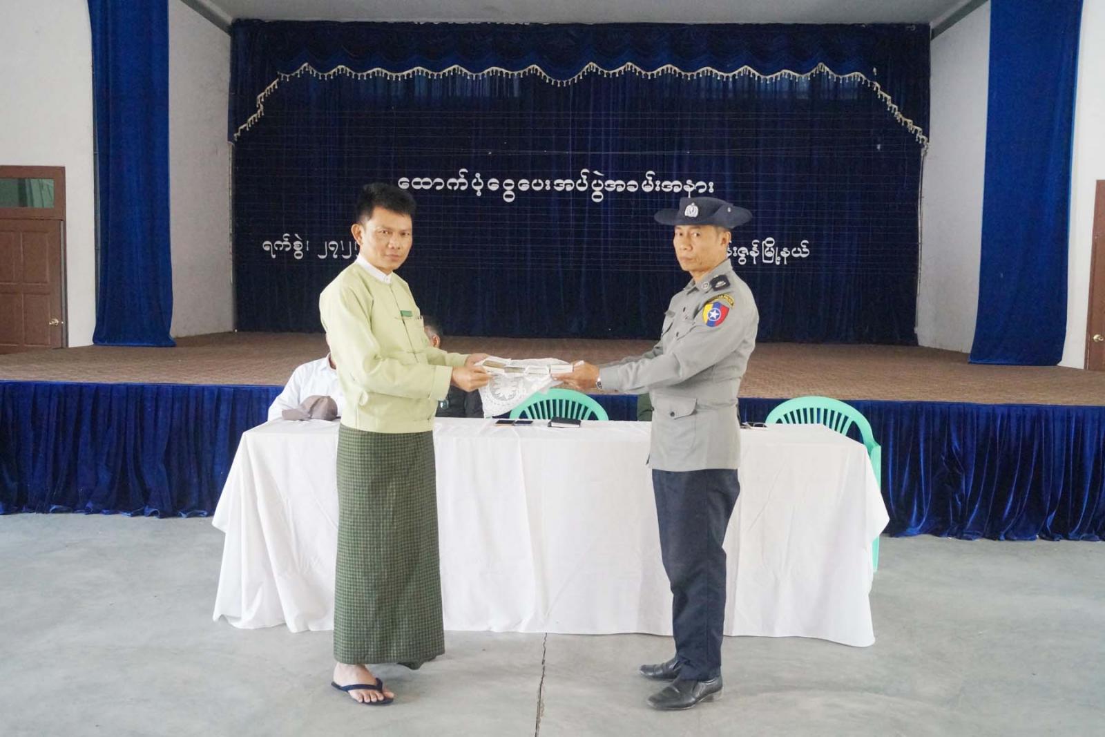 ရှေးဦးစွာ မြို့နယ်စီမံအုပ်ချုပ်ရေးအဖွဲ့ ဥက္က ဦးမျိုးမင်းသိန်းက ယာယီနေရပ်စွန့်ခွာပြည်သူများအား ငွေကျပ် (၂၀၀၀၀/-)နှုန်းစီ ထောက်ပံ့ပေးအပ်ခြင်းနှင့် ပတ်သက်၍ ရှင်းလင်းပြောကြားပြီး ယာယီနေရပ်စွန့်ခွာနေရသူ အိမ်ထောင်စု(၉၀)စု၊ လူဦးရေ (၃၈၆)ဦးတို့အား တစ်ဦးလျှင် ငွေကျပ် (၂၀၀၀၀/-) နှုန်းဖြင့် စုစုပေါင်း ငွေကျပ် (၇၇၂၀၀၀၀/-)အား မြို့နယ်ထောက်ပံ့ငွေဖြန့်ခွဲရေးအဖွဲ့ ဥက္က မြို့နယ်ရဲတပ်ဖွဲ့မှူး ရဲမှူးဝင်းဗိုလ်ထံသို့ လွှဲပြောင်းပေးအပ်သည်။