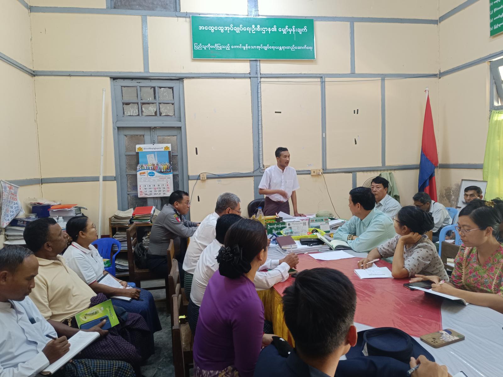 ရှေးဦးစွာ ဆွေးနွေးပွဲတွင် မြို့နယ်စီမံအုပ်ချုပ်ရေးအဖွဲ့ဥက္ကဋ္ဌ ဦးကျော်ဘုန်းမောင်မှ အဖွင့်အမှာစကားပြောကြားရာတွင် အကြမ်းဖက်ဖြစ်စဉ်များကြောင့် ယာယီနေရပ်စွန့်ခွာ ပြည်သူများအား လူသားချင်းစာနာမှုဖြင့် အမျိုးသားသဘာဝဘေးအန္တရာယ်ဆိုင်ရာ စီမံခန့်ခွဲမှုကော်မတီရန်ပုံငွေမှ လိုအပ်သည့် ထောက်ပံ့ငွေများပေးမည်ဖြစ်ကြောင်း၊ ယာယီနေရပ်စွန့်ခွာနေရသည့် ပြည်သူများအတွက် ထောက်ပံ့ငွေပေးအပ်ရာတွင် ယာယီနေရပ်စွန့်ခွာနေရသူများအားလုံး ပါဝင်မှုရှိစေရေးနှင့် စာရင်းတွင်မပါဝင်ဘဲ ကျန်နေခဲ့ရသူများမရှိစေရေးတို့အတွက် ဆောင်ရွက်ရန်လိုကြောင်း သဘာဝဘေးအန္တရာယ်ဆိုင်ရာ စီမံခန့်ခွဲမှုကော်မတီအဖွဲ့ဝင်များမှ တာဝန်ကျသော ရပ်ကွက်ကျေးရွာများအလိုက် ထောက်ပံ့ငွေများ ထောက်ပံ့ပေးနိုင်ပါရန် ဆွေးနွေးပြောကြားခဲ့သည်။
