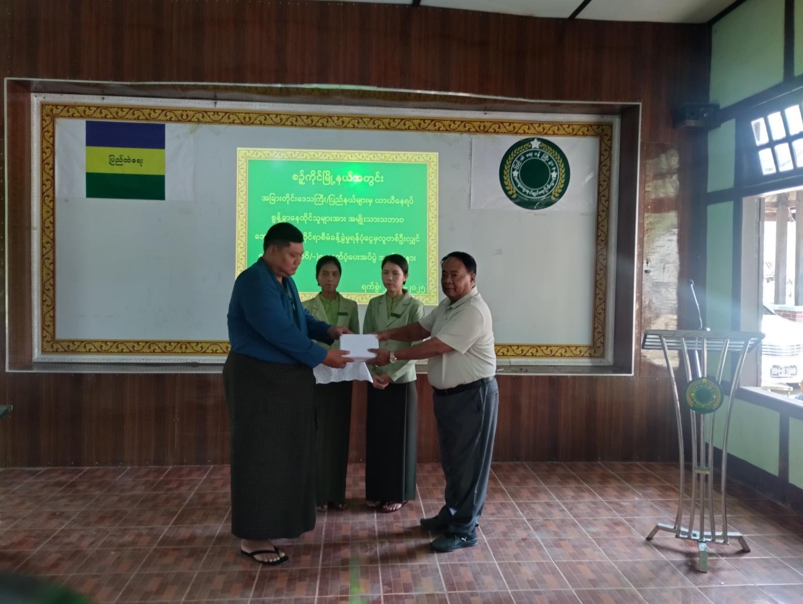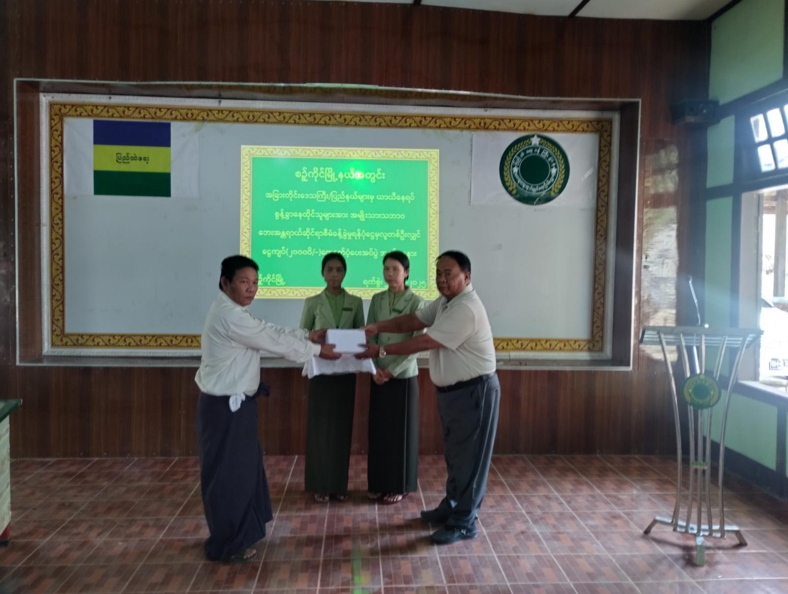 ရှေးဦးစွာ မြို့နယ်စီမံအုပ်ချုပ်ရေးအဖွဲ့ဥက္ကဋ္ဌ မြို့နယ်အုပ်ချုပ်ရေးမှူး ဦးဗိုလ်အောင်မောင်မောင်က အဖွင့်အမှာစကား ပြောကြားခဲ့ပြီးနောက် အမျိုးသားသဘာဝဘေးအန္တရာယ်ဆိုင်ရာ စီမံခန့်ခွဲမှု ရန်ပုံငွေမှ ယာယီနေရပ်စွန့်ခွာနေထိုင်သူ(၉၁၈)ဦးအတွက် ထောက်ပံ့ငွေကျပ် (၁၈၃၆ဝဝဝဝိ/-) ကျပ်ကို မြို့နယ်စီမံအုပ်ချုပ်ရေးအဖွဲ့ဥက္ကဋ္ဌက မြို့နယ်ထောက်ပံ့ရေးအဖွဲ့ အဖွဲ့ခေါင်းဆောင် ဦးရွှေခိုင်ထံသို့ ပေးအပ်ခဲ့သည်။