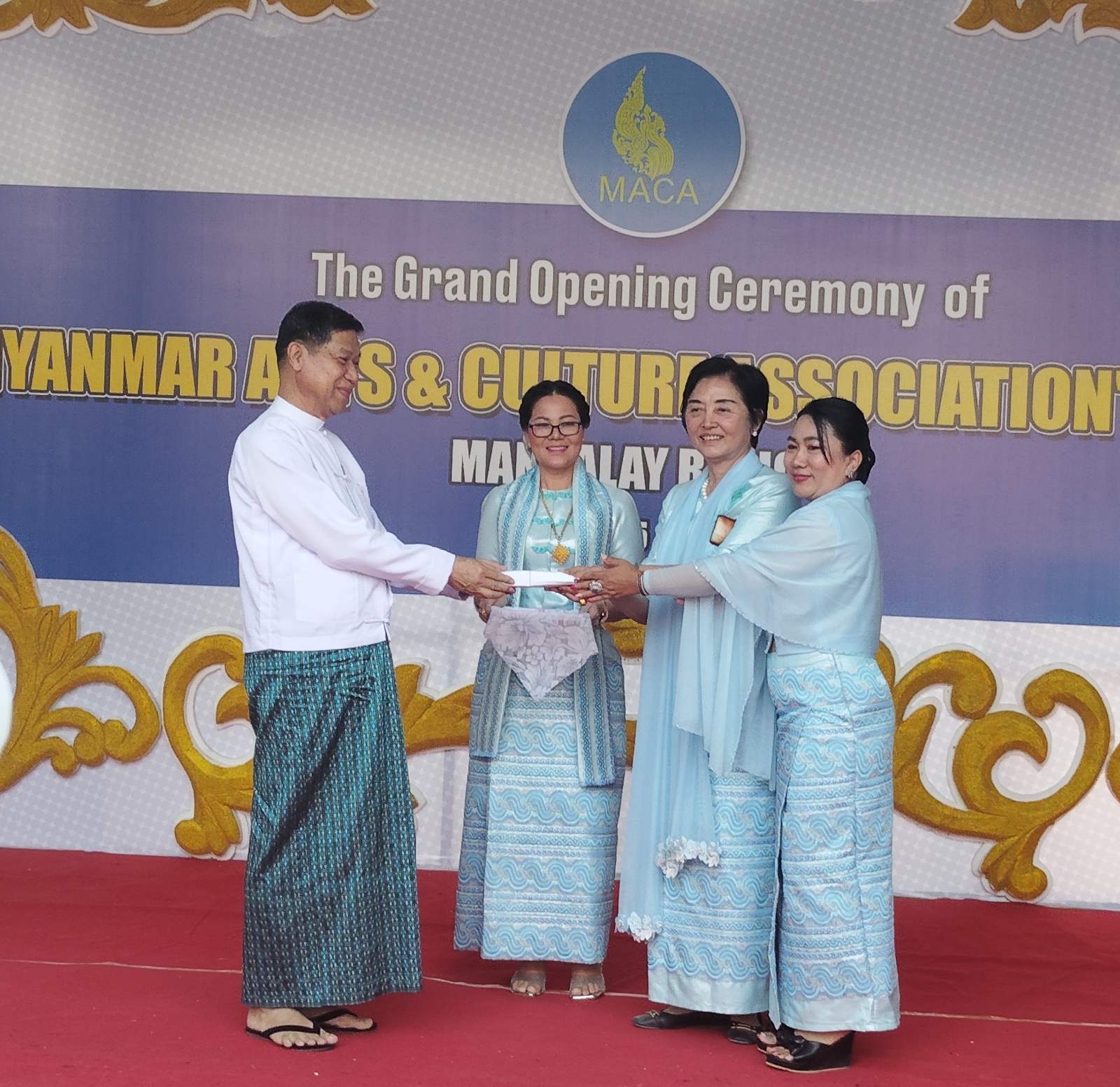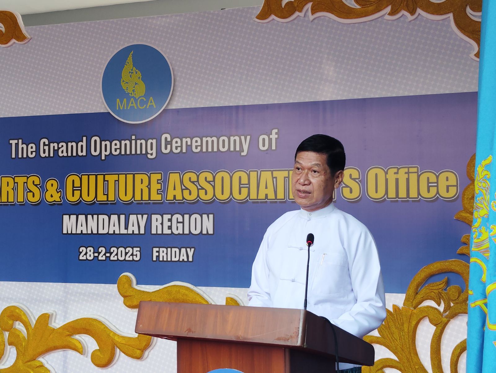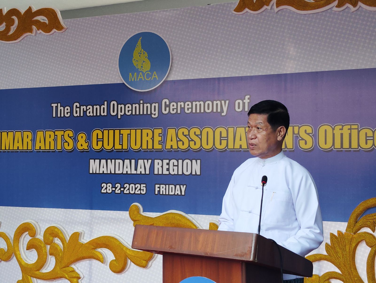 မန္တလေးတိုင်းဒေသကြီး၊ မဟာအောင်မြေခရိုင်၊ မဟာမြိုင် (၂) ရပ်ကွက်၊ အသင်းရုံး အဆောက်အဦတွင် မြန်မာ့အနုပညာနှင့် ယဉ်ကျေးမှုအသင်း (Myanmar Art & Culture Association- MACA) မန္တလေးရုံးခွဲ၊ ရုံးဖွင့်ပွဲ အခမ်းအနားအား ယနေ့နံနက်ပိုင်းက ကျင်းပပြုလုပ်ခဲ့ရာ အခမ်းအနားသို့ တိုင်ဒေသကြီးအစိုးရအဖွဲ့ဝန်ကြီးချုပ် ဦးမျိုးအောင်၊ တိုင်းဒေသကြီးတရားလွှတ်တော်တရားသူကြီးချုပ် ဒေါ်ခင်သင်းဝေ၊ လုံခြုံရေးနှင့် နယ်စပ်ရေးရာဝန်ကြီး ဗိုလ်မှူးကြီး နေလင်းစိုး၊ စည်ပင်သာယာရေးဝန်ကြီး ဦးကျော်ဆန်း၊ စီးပွားရေးရာဝန်ကြီး ဦးသိန်းဌေး၊ လူမှုရေးရာဝန်ကြီး ဦးအောင်ကျော်မိုး၊ လမ်းပန်း ဆက်သွယ်ရေးဝန်ကြီး ဦးအောင်ဇော်ဦး၊ အစိုးရအဖွဲ့အတွင်းရေးမှူး ဦးဝေဇင်ထွန်း တို့နှင့် ဌာနဆိုင်ရာတာဝန်ရှိသူများ၊ ဖိတ်ကြားထားသော ဧည့်သည်တော်များ စုစုပေါင်း (၁၅၀) ဦးခန့် တက်ရောက်ခဲ့ကြသည်။