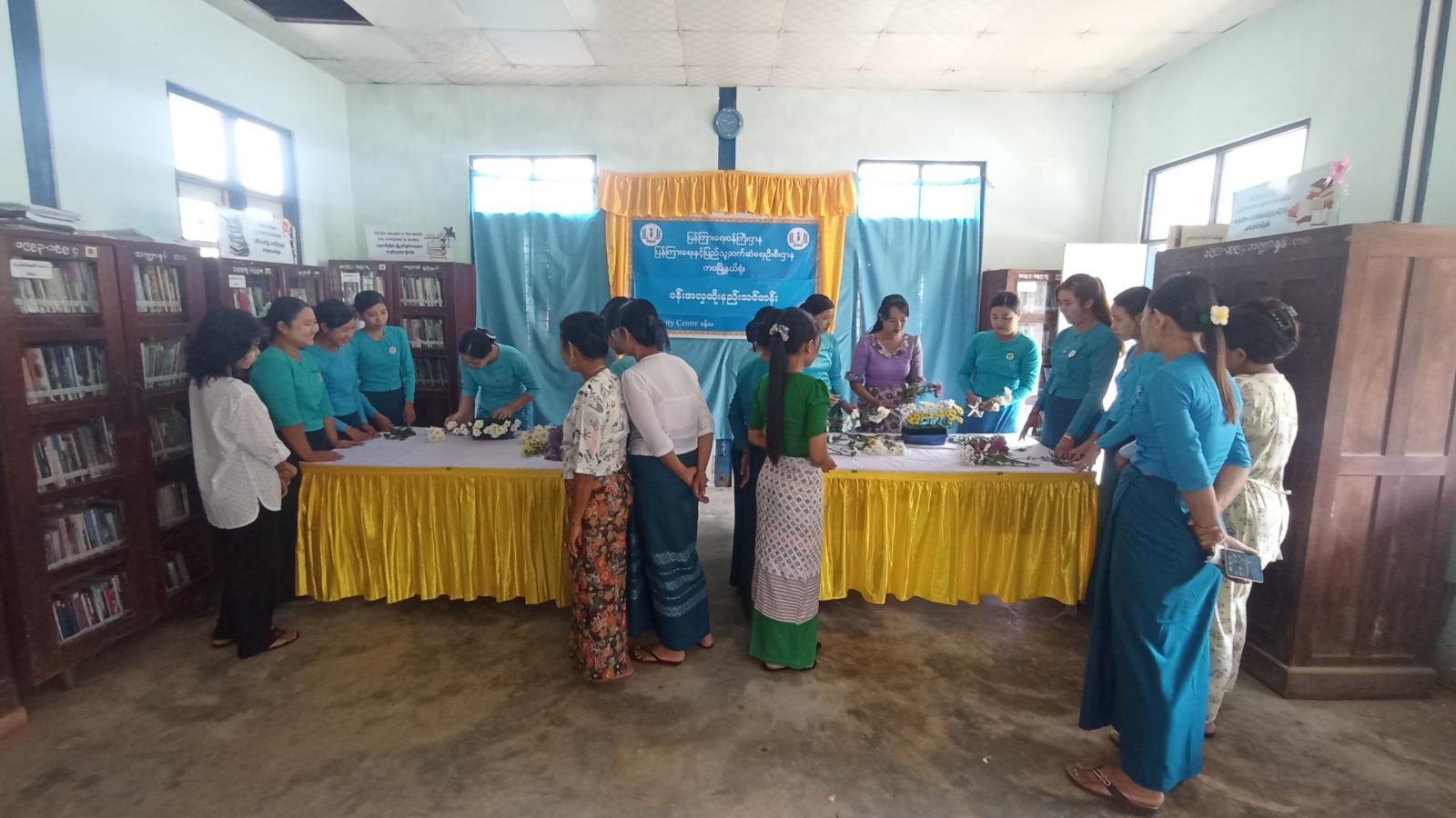 ထို့နောက် သင်တန်းကို ဖွင့်လှစ်ကာ တက်ရောက်လာသည့်သင်တန်းသား၊ သင်တန်းသူများကို မြို့နယ်အမျိုးသမီးရေးရာအဖွဲ့မှ သင်တန်းနည်းပြများက စက်ဝိုင်းပုံပန်းထိုးနည်း၊ ပန်းခြင်းပန်းထိုးနည်း၊ ယပ်တောင်ပုံ ပန်းထိုးနည်းစသည့် ပန်းအလှထိုးနည်းပညာရပ်များကို စာတွေ့လက်တွေ့ဖွင့်လှစ်ပို့ချသင်ကြားပေးခဲ့ကြသည်။