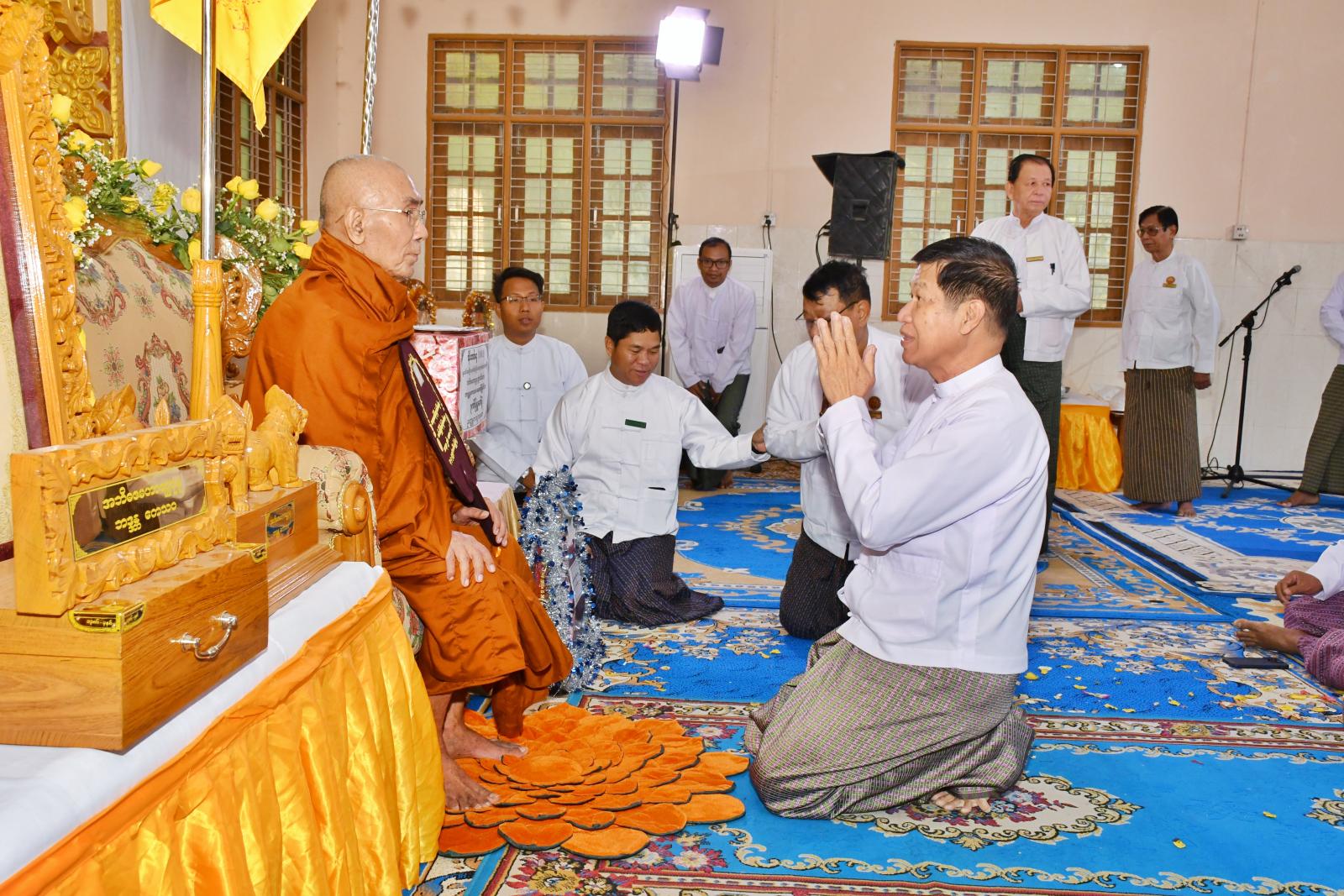 ရှေးဦးစွာ မန္တလေးတိုင်းဒေသကြီးအစိုးရအဖွဲ့ဝန်ကြီးချုပ် ဦးမျိုးအောင်သည် တိုင်းဒေသကြီးအစိုးရအဖွဲ့ဝင် ဝန်ကြီးများနှင့် တာဝန်ရှိသူများ လိုက်ပါပြီး ယနေ့နံနက်ပိုင်းက ရွှေအင်းဝဗိမာန်သို့ သွားရောက်ပြီး မန္တလေးတိုင်းဒေသကြီး ကျောင်းထိုင်ဘုန်းကြီးသင်တန်းကျောင်း၊ ကျောင်းအုပ်ဆရာတော် အဘိဓဇမဟာရဋ္ဌဂုရုဘဒ္ဒန္တကေသဝ မဟာထေရ်မြတ်ကြီးအား ဖူးမြော်၍ သာသာနာတော်ပြန့်ပွားရေးအတွက် ဝမ်းမြောက်ဂုဏ်ယူမိပါကြောင်း သာသနာရေးဆိုင်ရာများ လျှောက်ထား၍ သြဝါဒများခံယူပြီး လှူဖွယ်ပစ္စည်းများနှင့် နဝကမ္မဝတ္ထုငွေများ ဆက်ကပ်လှူဒါန်းသည်။