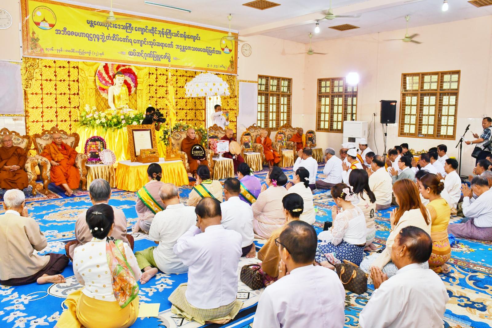 ရှေးဦးစွာ နမောတဿ သုံးကြိမ်ရွတ်ဆို ဘုရားကန်တော့၍ အခမ်းအနားကို ဖွင့်လှစ်ကာ အစီအစဉ်အတိုင်း ဆက်လက်ကျင်းပပြီး နိုင်ငံတော်ပရိယတ္တိသာသနာ့တက္ကသိုလ်(မန္တလေး) ပါမောက္ခချုပ်ဆရာတော်ထံမှ ငါးပါးသီလ ခံယူဆောက်တည်ကြပြီးနောက် ဆရာတော်၊ သံဃာတော်များ ရွတ်ပွားချီးမြှင့်တော်မူသည့် ပရိတ်တရားတော်များကို နာယူကြည်ညိုကြသည်။