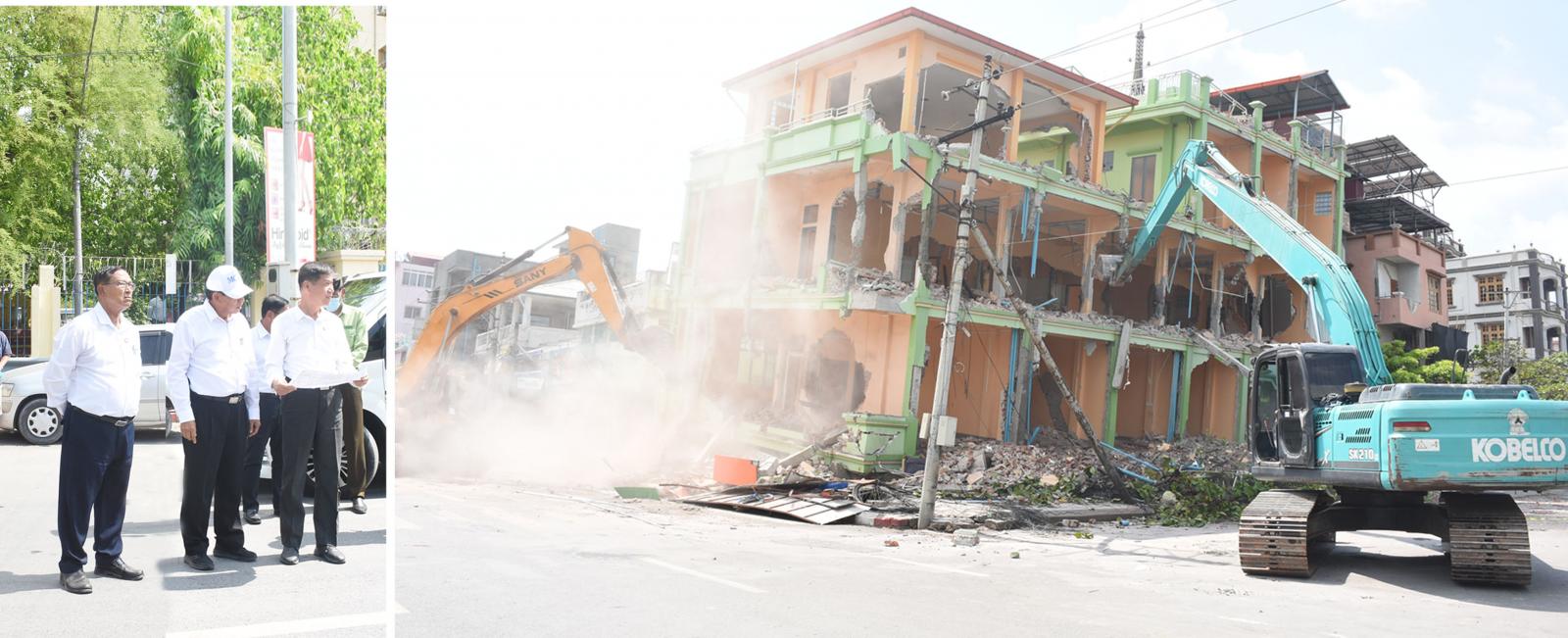ဆက်လက်၍ တိုင်းဒေသကြီးဝန်ကြီးချုပ်သည် ငလျင်ဒဏ်ကြောင့် ချမ်းအေးသာစံမြို့နယ်၊ လမ်း ၃၀နှင့်၇၆လမ်းထောင့်ရှိ ထိခိုက်ပျက်စီးသွားသော အန္တရာယ်ရှိအဆောက်အဦအား စက်ယန္တရားကြီးများဖြင့် ဖယ်ရှားရှင်းလင်းနေမှုကို သွားရောက်ကြည့်ရှုစစ်ဆေးပြီး လုပ်ငန်းခွင်တွင် အန္တရာယ်မရှိစေရန် စနစ်တကျပြုလုပ်ဆောင်ရွက်သွားရေးတို့ကို တာဝန်ရှိသူများအား မှာကြားပြီး လိုအပ်သည်များကို ဖြည့်ဆည်းဆောင်ရွက်ပေးခဲ့သည်။