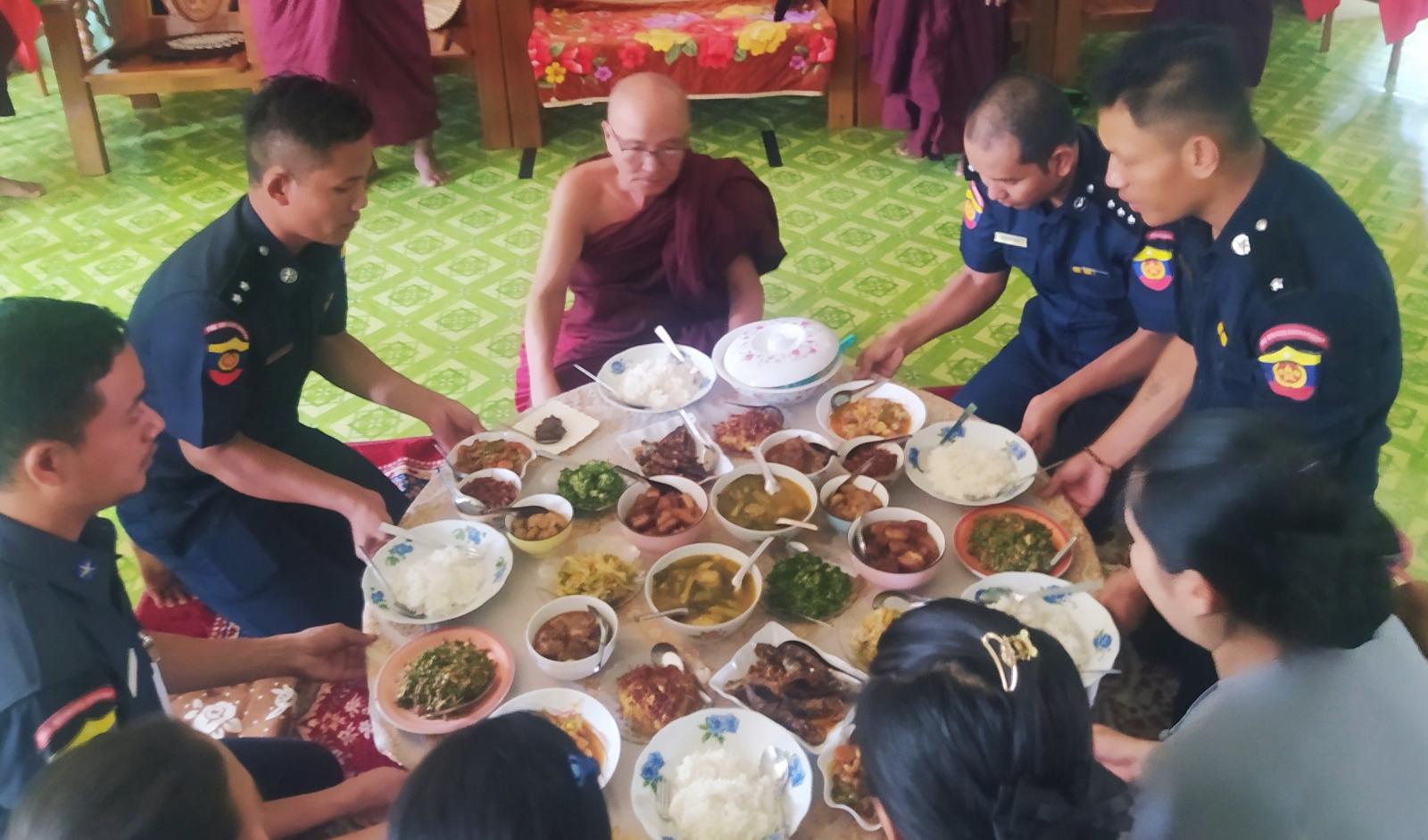 အခမ်းအနားတွင် မြို့နယ်မီးသတ်ဦးစီးမှူး ဦးစည်သူဝင်းဦးဆောင်၍ မီးသတ်တပ်ဖွဲ့ဝင်များနှင့် မိသားစုဝင်များစုပေါင်း၍ မြို့နယ်သံဃနာယကဥက္ကဋ္ဌ ဆရာတော်အား အမှူးထား၍ သံဃာတော်(၅) ပါးတို့အား ဆွမ်းဆက်ကပ်လှူဒါန်းခြင်း၊ ဆရာတော်များထံမှ ငါးပါးသီလခံယူခြင်းနှင့် အန္တရာယ်ကင်း ပရိတ်တရားနာယူခြင်းတို့ကို ဆောင်ရွက်ခဲ့ကြကြောင်း သိရသည်။