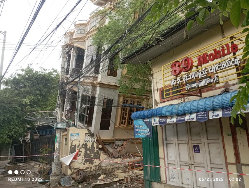မန္တလေးမြို့တွင် မေလ (၂၁) ရက် ၀၂း၃၀ ချိန်ခန့်မှစတင်၍ မိုးသည်းထန်စွာ ရွာသွန်းခဲ့ရာ ၀၄း၀၀ ချိန်ခန့်တွင် မဟာအောင်မြေမြို့နယ်၊ ဒေးဝန်းအရှေ့ရပ်ကွက်၊ ပဲပုတ္တန်းရပ်၊ အကွက်(၂၉၅)၊ ၈၉လမ်း၊ ၃၆x၃၇ လမ်းကြားရှိ ငလျင်ဒဏ်ကြောင့် ထိခိုက်ခဲ့သည့် လူမနေသော ၃ ထပ် RC အဆောက်အဦမှာ ဘေးသို့တိမ်းစောင်းသွားခဲ့ပြီး လူ/တိရစ္ဆာန် ထိခိုက်မှုမရှိကြောင်းနှင့် အဆိုပါ အဆောက်အဦမှာ ဖြိုဖျက်ရန်အတွက် သက်ဆိုင်ရာသို့ တင်ပြထားရှိပြီး အဆိုပါ ၃ ထပ် RC အဆောက်အဦသည် ပြိုလဲနိုင်သည့် အခြေအနေကြောင့် အဆောက်အဦဘေးရှိ ဖုန်းဆိုင် ၂ ဆိုင်နှင့် အိမ်ထောင်စု ၃ စုမှ လူဦးရေ ၁၀ ဦးအား ရပ်ကွက်အတွင်းရှိ ပဲပုတ်တန်း ဓမ္မာရုံနှင့် ရေပန်းဘုန်းကြီးကျောင်းသို့ ပြောင်းရွှေ့နေရာချထားကာ ရပ်ကွက်အုပ်ချုပ်ရေးမှူး ဦးကျော်ကျော်ဝေနှင့်အဖွဲ့ဝင်များ၊ မဏီစလ လူမှုကူညီရေးအသင်းတို့မှ လိုအပ်သည်များ ကူညီဆောင်ရွက်ပေးလျက်ရှိကြောင်း သိရသည်။