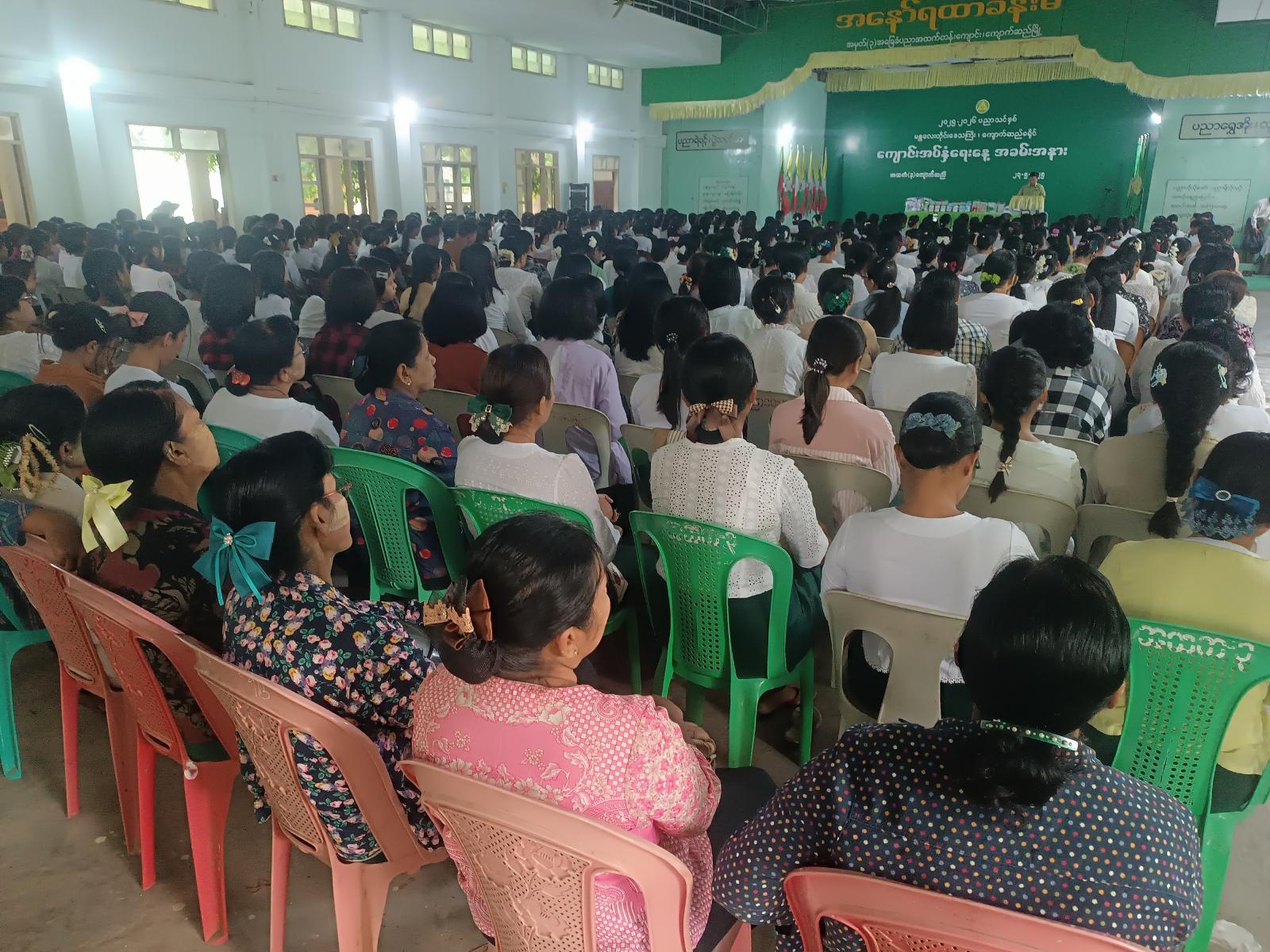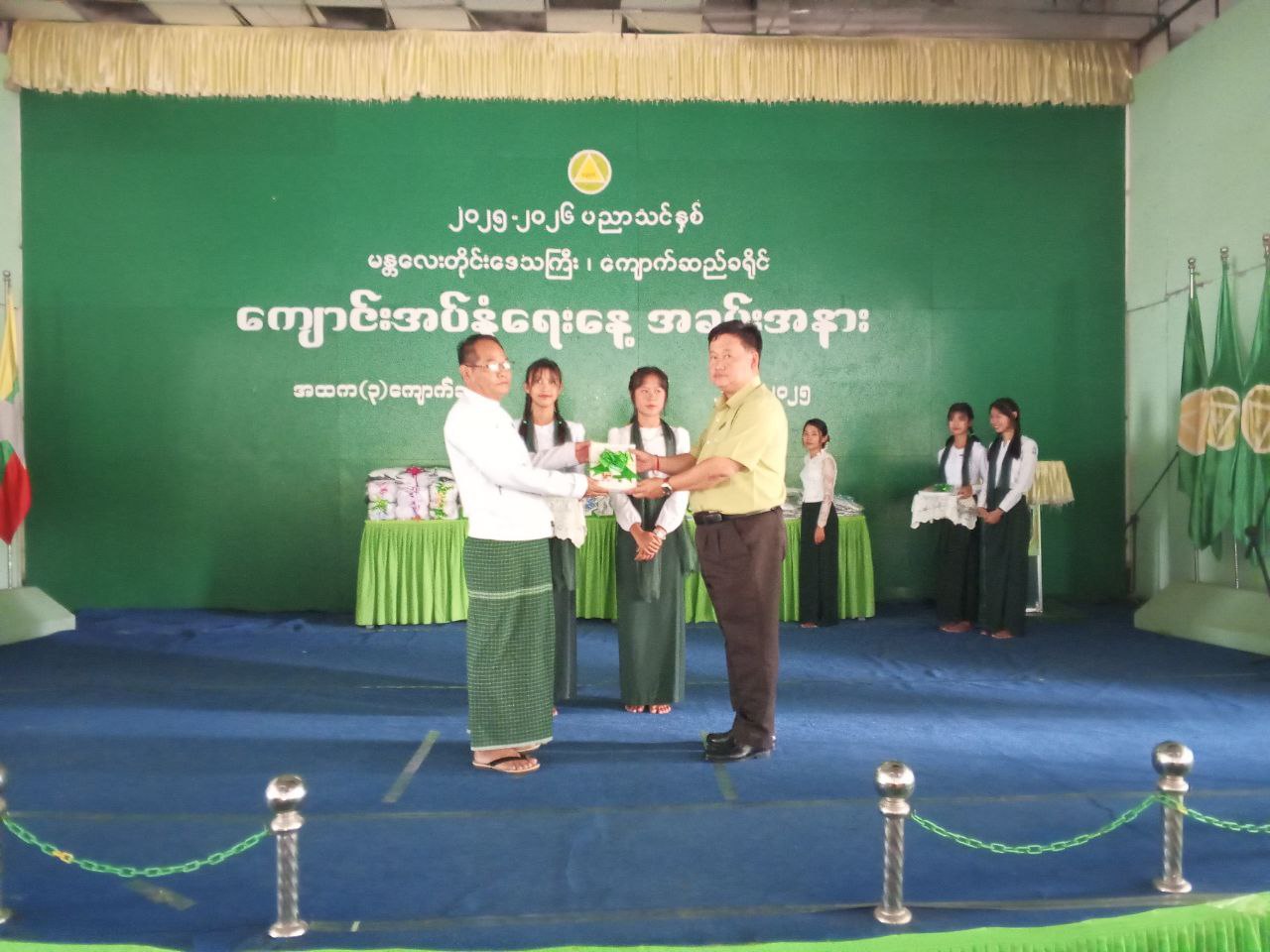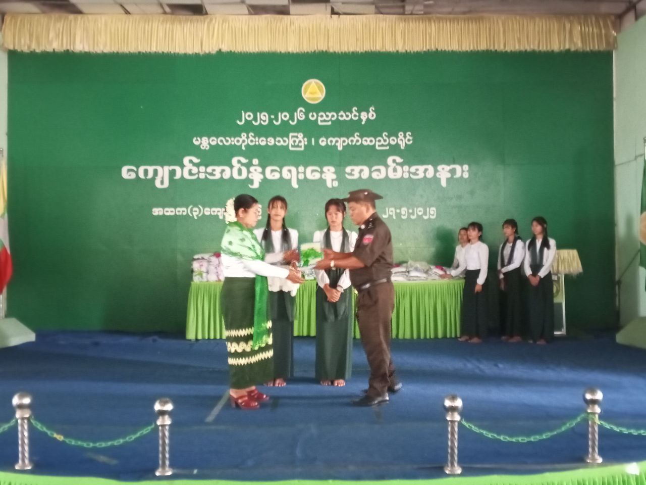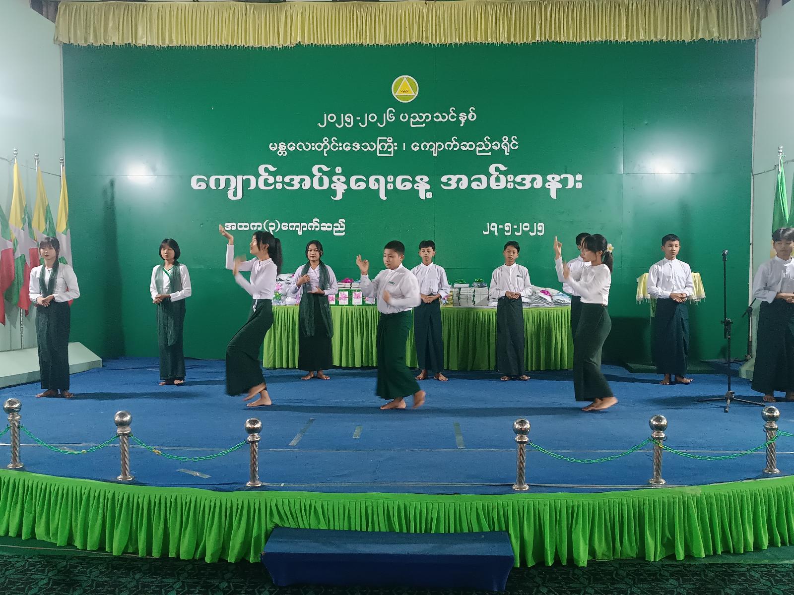 ထို့နောက် ကျောက်ဆည်ခရိုင်စီမံအုပ်ချုပ်ရေးအဖွဲ့ဥက္ကဋ္ဌ ဦးကောင်းမြတ်နိုင်၊ အဖွဲ့ဝင်(၂) ဦးအောင်သူ၊ အဖွဲ့ဝင်(၃)ဦးစိုးပိုင်တို့က ကျောက်ဆည်မြို့နယ်၊ စဉ့်ကိုင်မြို့နယ်၊ မြစ်သားမြို့နယ် ပညာရေးမှူများအား နိုင်ငံတော်မှအခမဲ့ဖြန့်ဝေသည့် ကျောင်းသုံးဗလာစာအုပ်များပေးအပ်ခဲ့ပြီး အမှတ်(၁)အခြေခံပညာအထက်တန်းကျောင်း ကျောင်းသား၊ကျောင်းသူလေးများက နှလုံးသားကိုအလှဆင်ပါသီချင်းဖြင့် သီဆိုကပြဖျော်ဖြေခဲ့ကြောင်း သိရသည်။