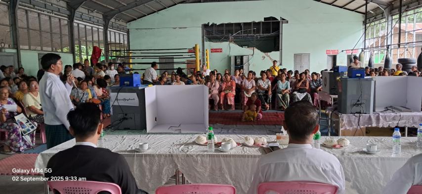 အလားတူ စိန်ပန်းရပ်ကွက် စိန်ပန်းအားကစားရုံ၌ကျင်းပရာ မြို့နယ်ရွေးကောက် ပွဲကော်မရှင်အဖွဲ့ခွဲ အတွင်းရေးမှူးက မဲပေးစက်ဆိုင်ရာ သိကောင်းစရာများကို ရှင်းလင်းပြောကြားပြီးနောက် တက်ရောက်လာသူများက မြန်မာအီလက်ထရောနစ်မဲပေးစက်ဖြင့် ကိုယ်တိုင်စမ်းသပ်မဲပေးခြင်းများကို လက်တွေ့ဆောင်ရွက်ခဲ့ကြသည်။