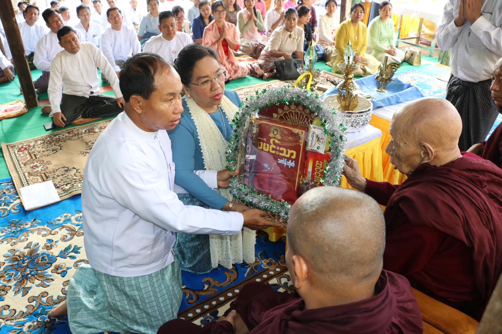ယင်းနောက် ဆရာတော်ကြီးများထံ တိုင်းဒေသကြီးဝန်ကြီးချုပ်နှင့်ဇနီး၊ တိုင်းဒေ သကြီးအစိုးရ အဖွဲ့ဝင်များနှင့်ဇနီးများက စိန်ဖူးတော်နှင့် လှူဖွယ်ဝတ္ထုပစ္စည်းများအား ဆက်ကပ်လှူဒါန်းကြသည်။ ဆက်လက်၍ စစ်ကိုင်းမြို့၊ မြို့နယ်သံဃနာယကအဖွဲ့ဥက္ကဋ္ဌ၊ ပြည်တော်အေး ကျောင်းတိုက် ဘဒ္ဒန္တပညာဝံသ ဆရာတော်ကြီးထံမှ တိုင်းဒေသကြီးဝန်ကြီးချုပ်နှင့် ဧည့်ပရိတ်များက အနုမောဒနာ တရား နာယူကြည့်ညိုပြီး လှူဒါန်းမှုအစုစုတို့အတွက် ရေစက် သွန်းချအမျှပေးဝေကာ “ဗုဒ္ဓ သာသနံ စိရံတိဌတု”သုံးကြိမ်ရွတ်ဆိုဆုတောင်ပြီး အခမ်းအနားကို ရုပ်သိမ်းခဲ့ကြသည်။