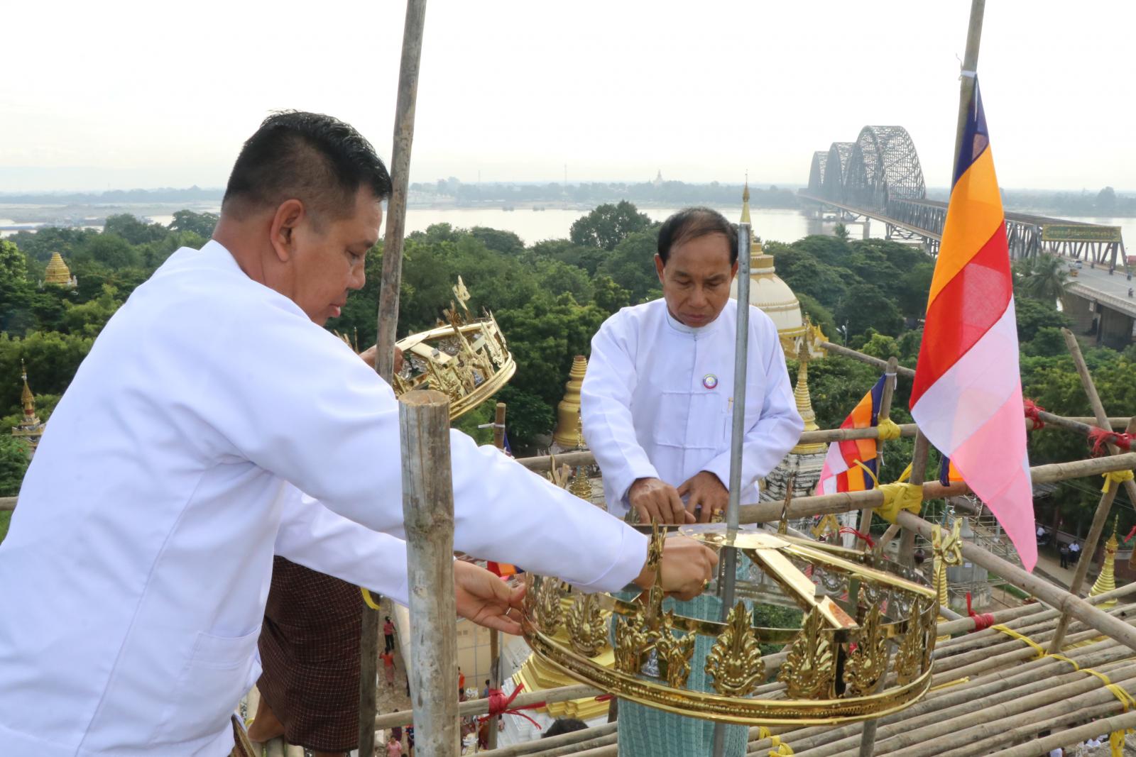 ထို့နောက် တိုင်းဒေသကြီးဝန်ကြီးချုပ်နှင့် တိုင်းဒေသကြီးအစိုးရအဖွဲ့ဝင်များက မင်္ဂလာအချိန် ကျရောက်သည့်နှင့် တစ်ပြိုင် နက် သံ၊ ဂုဏ်၊ ပ၊ မ ဆုတောင်းပြည့်စေတီတော်နှင့် အောင်ချမ်းသာ ဆုတောင်းပြည့်စေတီတော် ရွှေထီးတော်ဘုံအဆင့်ဆင့်နှင့် ငှက်မြတ်နားတော်၊ စိန်ဖူးတော်တို့အား တင်လှူပူဇော်ကြပြီး အမွှေးနံ့သာရေများပတ်ဖျန်းကာ ရွှေမိုးငွေမိုးများ ရွာသွန်းဖြိုးခဲ့ကြသည်။