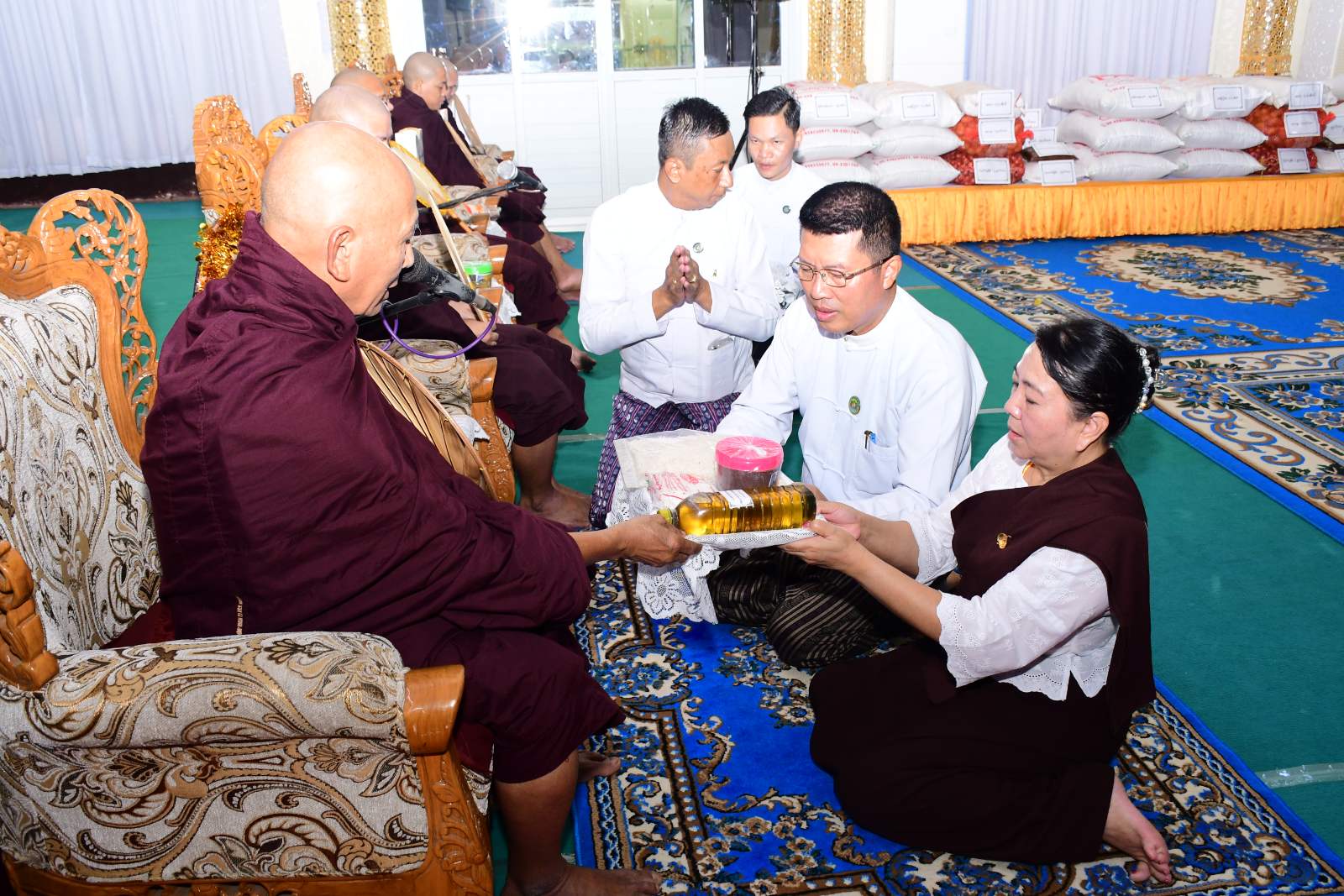 ထို့နောက် ဆရာတော်သံဃာတော် အရှင်သူမြတ်များအား တိုင်းဒေသကြီးဝန်ကြီးချုပ်နှင့် ဇနီး၊ တိုင်းဒေသကြီး ဝန်ကြီးများနှင့် ဇနီးများက လှူဖွယ်ဝတ္ထုပစ္စည်းများဆက်ကပ်လှူဒါန်းခဲ့ကြကာ ပုသိမ်မြို့ ကျောင်းထိုင်ဘုန်းကြီးသင်တန်းကျောင်း ကျောင်းအုပ်ဆရာတော် (မဟာသဒ္ဓမ္မဇောတိကဓဇ)ဒေါက်တာဘဒ္ဒန္တဇောတိဿရ မထေရ်မြတ်ထံမှ အနုမောဒနာတရားနာကြား၍ လှူဒါန်းမှုအစုစုတို့အတွက် ရေစက်သွန်းချအမျှပေးဝေသည်။ ယင်းနောက် ဆရာတော်သံဃာတော်အရှင်သူမြတ်များအား နေ့ဆွမ်းဆက်ကပ်လှူဒါန်းခဲ့ကြပြီး ဧည့်ပရိသတ်များအား နေ့လယ်စာဖြင့် ကျွေးမွေးလှူဒါန်းသည်။
