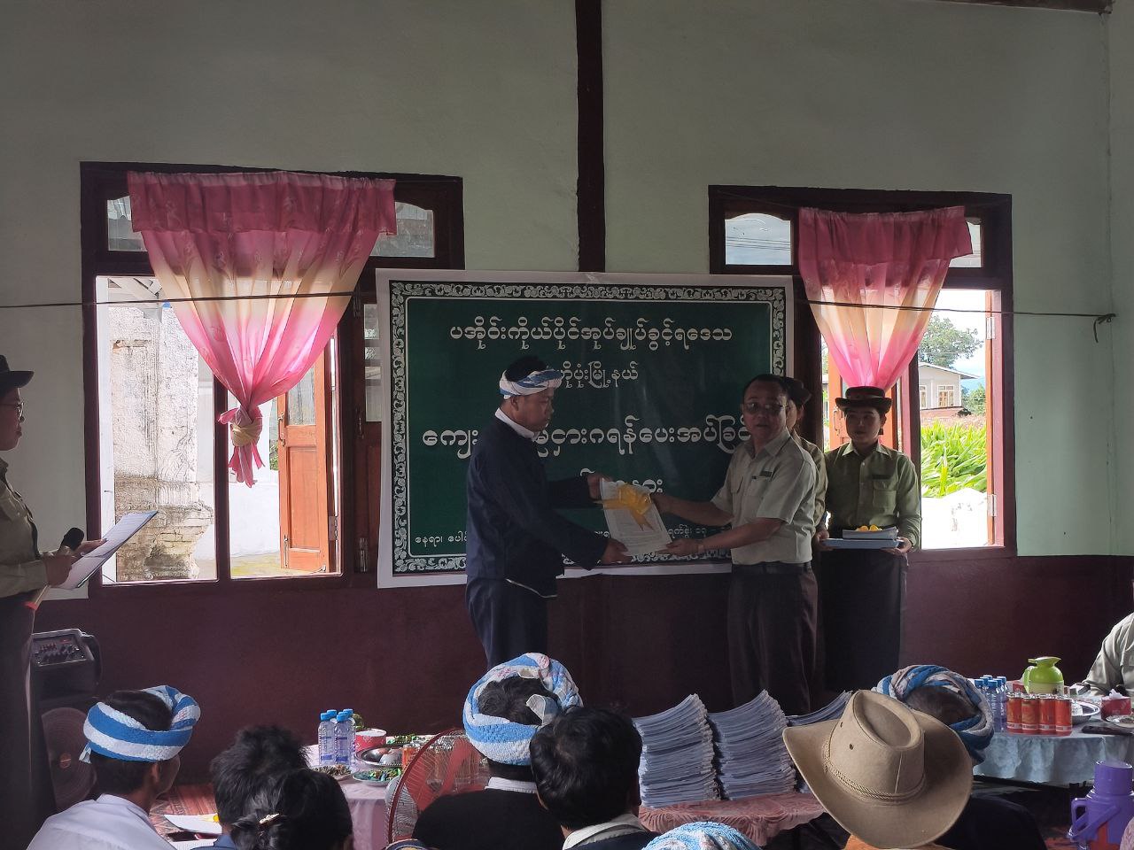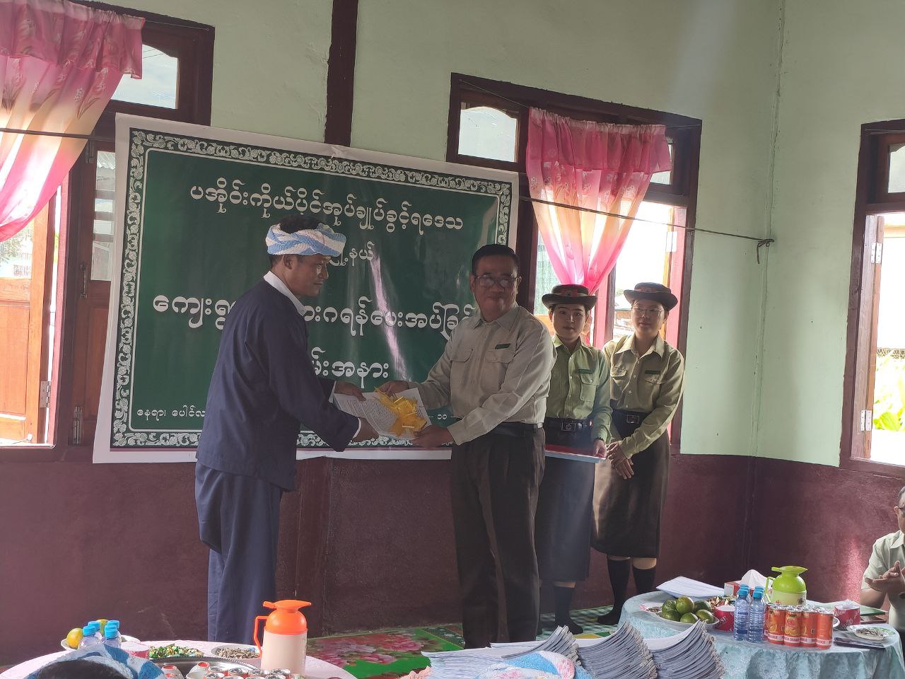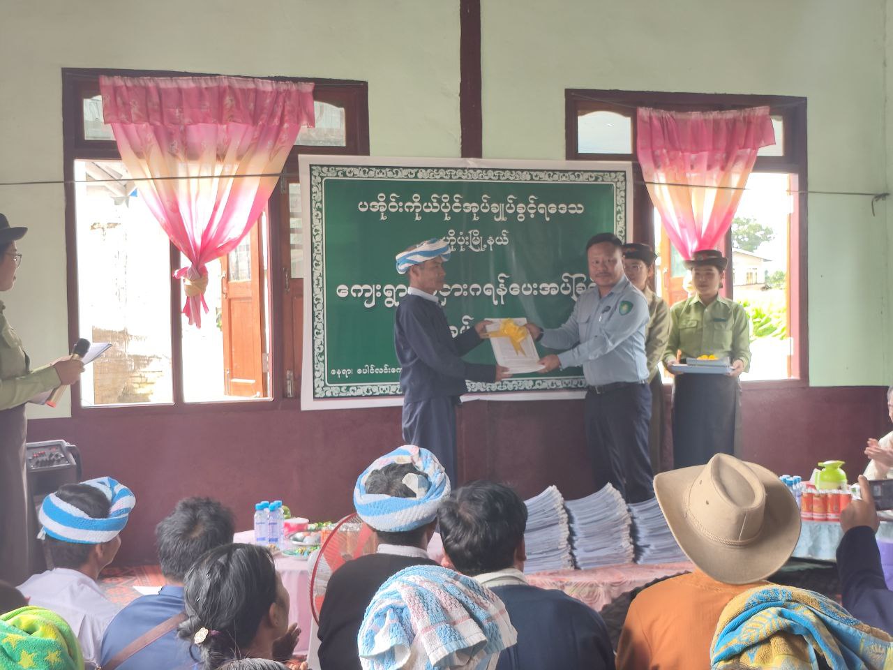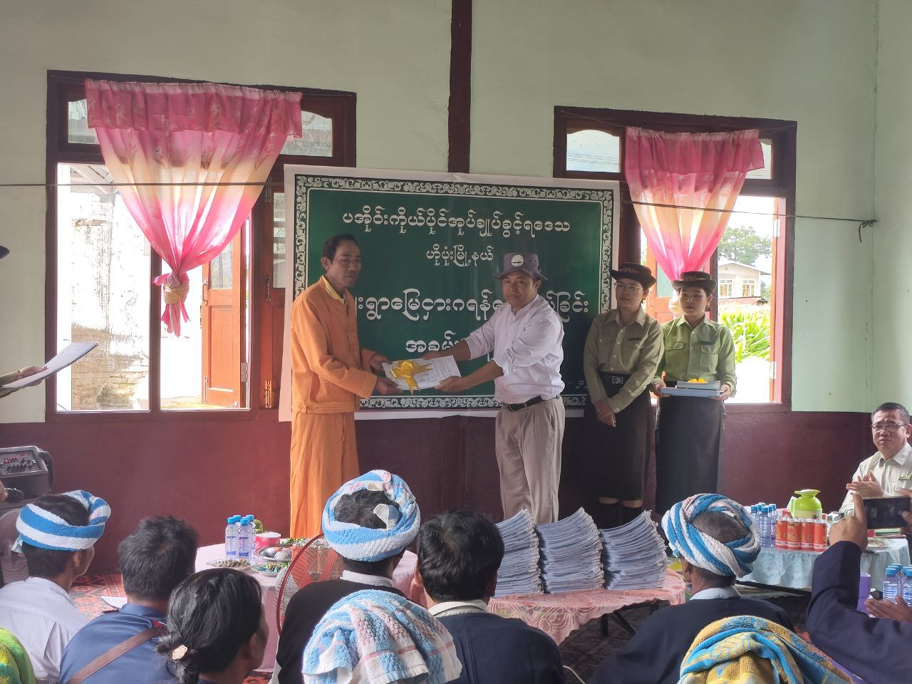 ထို့နောက် ပအိုဝ်းကိုယ်ပိုင်အုပ်ချုပ်ခွင့်ရဒေသ ဦးစီးအဖွဲ့ အတွင်းရေးမှူး ဦးမျိုးအောင်၊ ပအိုဝ်းကိုယ်ပိုင်အုပ်ချုပ်ခွင့်ရဒေသ အထွေထွေအုပ်ချုပ်ရေးဦးစီးမှူးရုံးမှ လက်ထောက်ညွှန်ကြားရေးမှူး ဦးအောင်ကျော်မြင့်၊ မြို့နယ်စီမံခန့်ခွဲရေးနှင့် အုပ်ချုပ်ရေးကော်မတီဥက္ကဋ္ဌ ဦးခွန်သိန်းရွှေ၊ ကြေးတိုင်နှင့် မြေစာရင်းဦးစီးဌာနမှ ဒုတိယဦးစီးမှူး ဦးဘွေထန်းနှင့် တာဝန်ရှိသူများက ပေါင်လင်းကျေးရွာအုပ်စု၊ နံကင်ကျေးရွာ မြေငှားဂရမ်(၈၈)ခုအား ပေးအပ်ခဲ့ကြောင်း သိရသည်။