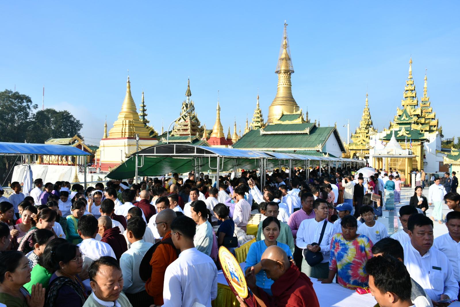 ဦးစွာ နံနက် ၅ နာရီခွဲအချိန်တွင် ဗုဒ္ဓမြတ်စွာအမှူးပြုသော ဩဝါဒါစရိယဆရာတော်ကြီး ၁၀ ပါးအပါအဝင် သံဃာတော် ၁၀၈ ပါးတို့ကို အရုဏ်ဆွမ်းဆက်ကပ်လှူဒါန်းပြီး စေတီတော်ရင်ပြင် အာရုံခံတန်ဆောင်း(၄)ခု၌ သံဃာတော် ၂၇ပါးစီဖြင့်ဗုဒ္ဓါဘိသေက ဘုရားအနေကဇာ တင်ခြင်း၊ စေတီတော်ရှိပုညကရဏ လေးထပ်ဓမ္မာရုံ၌ ဩဝါဒါစရိယဆရာတော်ကြီး ၁၀ပါးနှင့် သံဃာတော် ၉၈ ပါးတို့ကို ပင့်ဖိတ်၍ တရားတော်နာယူပွဲကျင်းပကာ လှူဖွယ်ဝတ္ထုပစ္စည်းများ ဆက်ကပ်လှူဒါန်းခြင်းတို့ပြုလုပ်သည်။