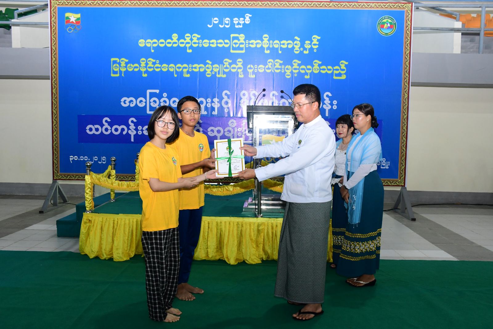 ထို့နောက် တိုင်းဒေသကြီးဝန်ကြီးချုပ်က သင်တန်းသား၊ သင်တန်းသူများအား သင်တန်းဆင်းလက်မှတ်များကို လည်းကောင်း၊ အမျိုးသားU-12 မီတာ(၅၀)အလွတ်ကူးပြိုင်ပွဲ၊ အမျိုးသားမီတာ(၅၀)ပက်လက်ကူးပြိုင်ပွဲ၊ အမျိုးသားမီတာ(၅၀) ရင်ဘောင်တန်းကူးပြိုင်ပွဲ၊ အမျိုးသားမီတာ(၅၀)လိပ်ပြာကူးပြိုင်ပွဲ၊ အမျိုးသား မီတာ(၅၀)အလွတ်ကူးပြိုင်ပွဲနှင့် အမျိုးသားဒိုင်ဗင်ပြိုင်ပွဲများတွင် ပထမ၊ ဒုတိယ၊ တတိယဆုရရှိသူများအား တစ်ဦးချင်းဆုတံဆိပ်များနှင့် ဂုဏ်ပြုချီးမြှင့်ငွေများကိုလည်းကောင်း၊ နည်းပြအဖွဲ့များအား ဂုဏ်ပြုချီးမြှင့်ငွေများကိုလည်းကောင်း၊ အမျိုးသမီးမီတာ(၅၀)လက်ပစ်ကူးပြိုင်ပွဲ၊ အမျိုးသမီးမီတာ(၅၀) ရင်ဘောင်တန်းကူးပြိုင်ပွဲ၊ အမျိုးသမီးမီတာ(၅၀)လိပ်ပြာကူးပြိုင်ပွဲ၊ အမျိုးသမီးမီတာ(၅၀)အလွတ်ကူးပြိုင်ပွဲ၊ အမျိုးမီးဒိုင်ဗင်ပြိုင်ပွဲတွင် ပထမ၊ ဒုတိယနှင့် တတိယဆုရရှိသူများအား တစ်ဦးချင်းဆုတံဆိပ်များနှင့် ဂုဏ်ပြုချီးမြှင့်ငွေများကို တိုင်းဒေသကြီးတရားကြီးချုပ်နှင့် တိုင်းဒေသကြီးဥပဒေချုပ်တို့ကလည်းကောင်း ဆုများအသီးသီးချီးမြှင့်ခဲ့ပြီးနောက် တိုင်းဒေသကြီးဝန်ကြီးချုပ်သည် သင်တန်းသားများ၏ ရေကူးနှင့် ဒိုင်ဗင်သရုပ်ပြသမှုများကို ကြည့်ရှုအားပေးခဲ့ကြောင်းနှင့် သင်တန်းကိုယခုလ(၁၀)ရက်နေ့မှ (၃၀)ရက်နေ့အထိ ဖွင့်လှစ်သင်ကြားပေးခဲ့ကြောင်းသိရသည်။