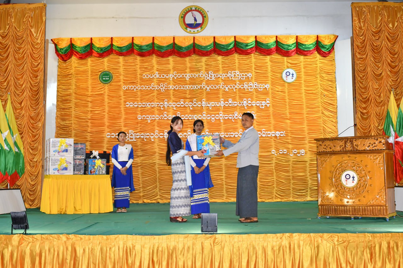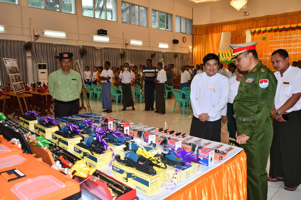ယင်းနောက် ခရိုင်အသေးစားစက်မှုလက်မှုလုပ်ငန်းဦးစီးဌာန ခရိုင်ဦးစီးမှူး ဦးစိုးထက်အောင်မှ မိသားစုဝင်ငွေတိုးရေးစီမံကိန်းလုပ်ငန်းစဉ်များအား ရှင်းလင်းပြောကြားခဲ့ပြီး တာဝန်ရှိသူများက ထူးချွန်သင်တန်းသား၊ သင်တန်းသူ(၁၅)ဦးအား အသေးစားကုန်ထုတ်လုပ်ငန်းများ ဖန်တီးပေးနိုင်ရေးနှင့် ကျေးလက်နေမိသားစုဝင်ငွေတိုးရေးစီမံကိန်း၊ ဒေသဖွံ့ဖြိုးရေးလုပ်ငန်းသုံးစက်ပစ္စည်းများအား ပေးအပ်၍ သင်တန်းသူတစ်ဦးက ကျေးဇူးတင်စကားပြန်လည်ပြောကြားခဲ့ကြောင်း သိရသည်။
