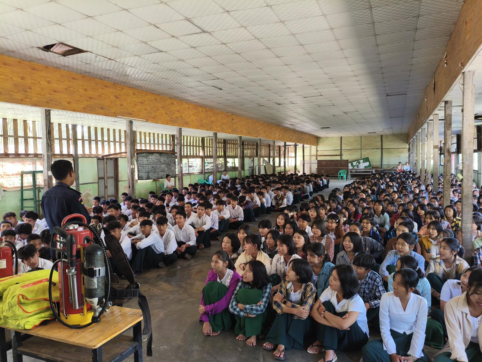 အဆိုပါ ဟောပြောပွဲအခမ်းအနားတွင် တောင်တွင်းကြီးမြို့နယ် မီးသတ်ဦးစီးဌာနမှ မီးသတ်ဦးစီးမှူး ဦးစောမောင်က မီးဘေးလုံခြုံကာကွယ်ရေး အသိပညာပေးဆွေးနွေးရခြင်း ရည်ရွယ်ချက်များ၊ မီးလောင်မှုအခြေခံသဘောတရားများ၊ မီးငြှိမ်းသတ်ခြင်းစနစ်များ၊ မီးအတန်းအစားခွဲခြားခြင်းများ၊ လျှပ်စစ်မီးလောင်မှုဖြစ်စေသည့် အဓိကအကြောင်းအရင်းများ၊ လျှပ်စစ်ဝါယာလျှော့မဖြစ်အောင် ကာကွယ်ရမည့် နည်းလမ်းများ၊ မီးကိုမပေါ့ဆကြရန်နှင့် မီးလောင်ပါက ပစ္စည်းဆုံးရှုံးမှုသာမက အသက်အိုးအိမ်များပါ ပျက်စီးဆုံးရှုံးတတ်ကြောင်းကို ရှင်းလင်းဟောပြောခဲ့ပြီး မီးသတ်ဦးစီးဌာန၏ သတ်မှတ်ထားသည့် ဝတ်စုံအမျိုးအစား(၄)မျိုးအကြောင်းနှင့် မီးဘေးအန္တရာယ် ဖြစ်ပေါ်လာပါက ကျောင်းသား၊ကျောင်းသူများ စိုးရိမ်ထိတ်လန့်မှုကင်းစွာ ကြိုတင်မီးငြှိမ်းသတ်နိုင်မည့် နည်းလမ်းများ၊ မီးသတ်ဆေးဘူး အသုံးပြုမှု အခြေခံနည်းလမ်းများအား လက်တွေ့သရုပ်ပြခဲ့ကြကြောင်း သိရသည်။