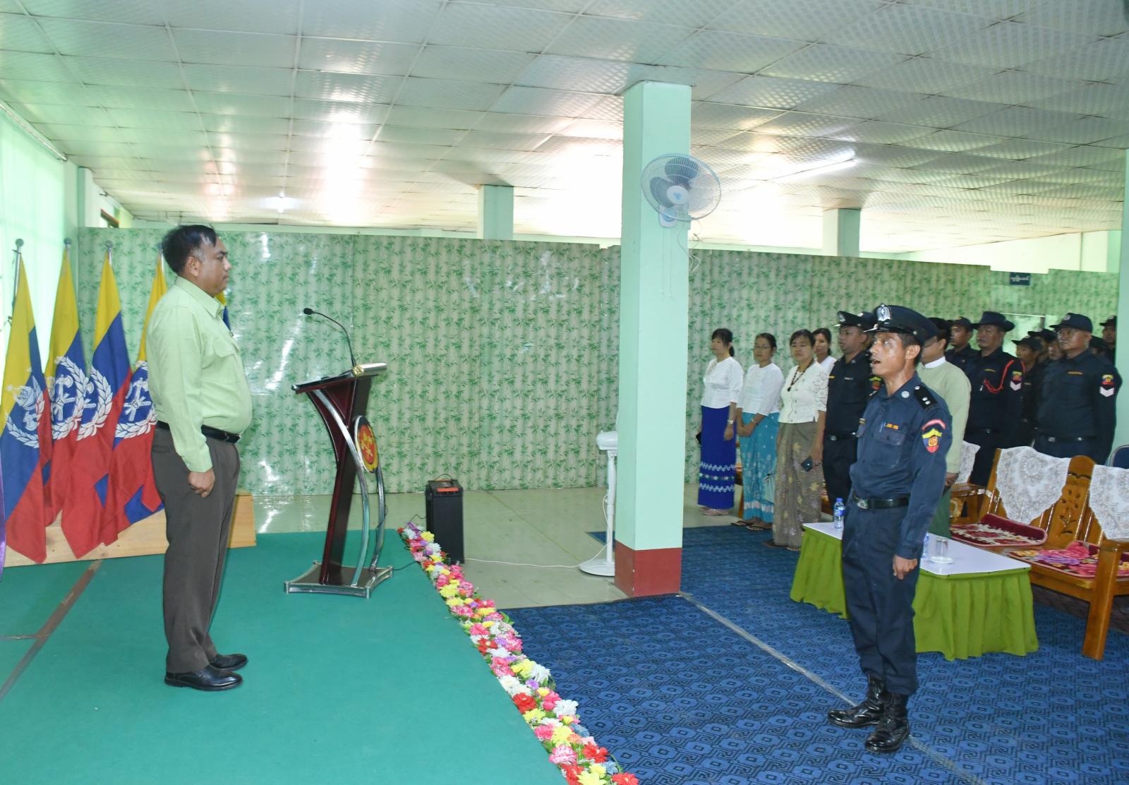 ဦးစွာ မြို့နယ်အုပ်ချုပ်ရေးမှူး ဦးနေလင်းထွန်းက အဖွင့်အမှာစကားပြောရာတွင် '' ပြည်ထဲရေးဝန်ကြီးဌာန အနေဖြင့် နိုင်ငံတော်လုံခြုံရေး၊ တရားဥပဒေ စိုးမိုးရေး၊ ရပ်ရွာအေးချမ်းသာယာရေးနှင့် ပြည်သူ့အကျိုးပြုဆောင်ရွက်ရေးစသည့် ရည်မှန်းချက်တာဝန်များကို အကောင်အထည်ဖော်လျက် ရှိသည့်အတွက် မီးသတ်တပ်ဖွဲ့ကလဲ မီးဘေးလုံခြုံရေး၊ သဘာဝဘေးအန္တရာယ်ကာကွယ်ရေး၊ ရှာဖွေကယ်ဆယ်ရေးနှင့် ပြည်သူ့အကျိုးပြုဆောင်ရွက်ရေးစသည့် ရည်မှန်းချက်တာဝန် (၄)ရပ်ကို အောင်မြင်စွာ ဆောင်ရွက်သွားရမှာဖြစ်တယ်။ မြို့နယ်အတွင်း ၂၀၂၅ခုနှစ် ဇန်နဝါရီလ (၁)ရက်နေ့မှ ယနေ့အချိန်ထိ မီးလောင်မှု (၁၃)ကြိမ်၊ ဆုံးရှုံးတန်ဖိုးမှာ ကျပ်ငါးရာငါးဆယ့်တစ်သိန်းနှစ်သောင်းနှစ်ထောင်ငါးရာခန့် မီးလောင်ဆုံးရှုံးခဲ့ပြီး၊ မီးလောင်မှုလျော့နည်းကျဆင်းအောင် အစွမ်းကုန်ကြိုးစားကြရမှာ ဖြစ်တယ်။ မီးသတ်တပ်ဖွဲ့အနေဖြင့် ပြည်သူလူထု၏ အကျိုးစီးပွားကို ကာကွယ်ကြရန်၊ ကူညီစောင့်ရှောက်သွားရန်၊ ကိုယ်စိတ်နှစ်ပါး ချမ်းသာမှုရအောင် လုပ်ဆောင်ကြရန်၊ အားကိုးယုံကြည်ရတဲ့ မီးသတ်တပ်ဖွဲ့ဖြစ်စေရေး တပ်ဖွဲ့ဝင်များ စွမ်းဆောင်ရည် မြှင့်တင်ကြရန်၊ မီးသတ်တပ်ဖွဲ့၏ အစဥ်အလာကောင်းများကို ဆက်လက်ထိန်းသိမ်းပြီး ကြိုးစားဆောင်ရွက်ကြဖို့'' ပြောကြားသည်။