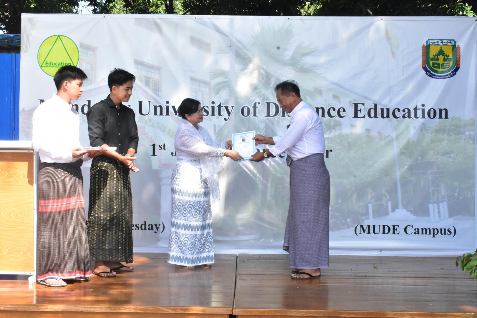 ရှေးဦးစွာ မန္တလေးအဝေးသင်တက္ကသိုလ် ပါမောက္ခချုပ် ဆရာမကြီး ဒေါက်တာခင်သန့်စင်က အဖွင့်အမှာစကား ပြောကြားခဲ့ပြီး Job and Career Fair အလုပ်အကိုင်နှင့် သက်မွေးမှုလုပ်ငန်းအခွင့်အလမ်းတွင် ပူးပေါင်းပါဝင် ပံ့ပိုးပေးသော လုပ်ငန်းများအား ဂုဏ်ပြုမှတ်တမ်းလွှာများ ပေးအပ်ခဲ့သည်။