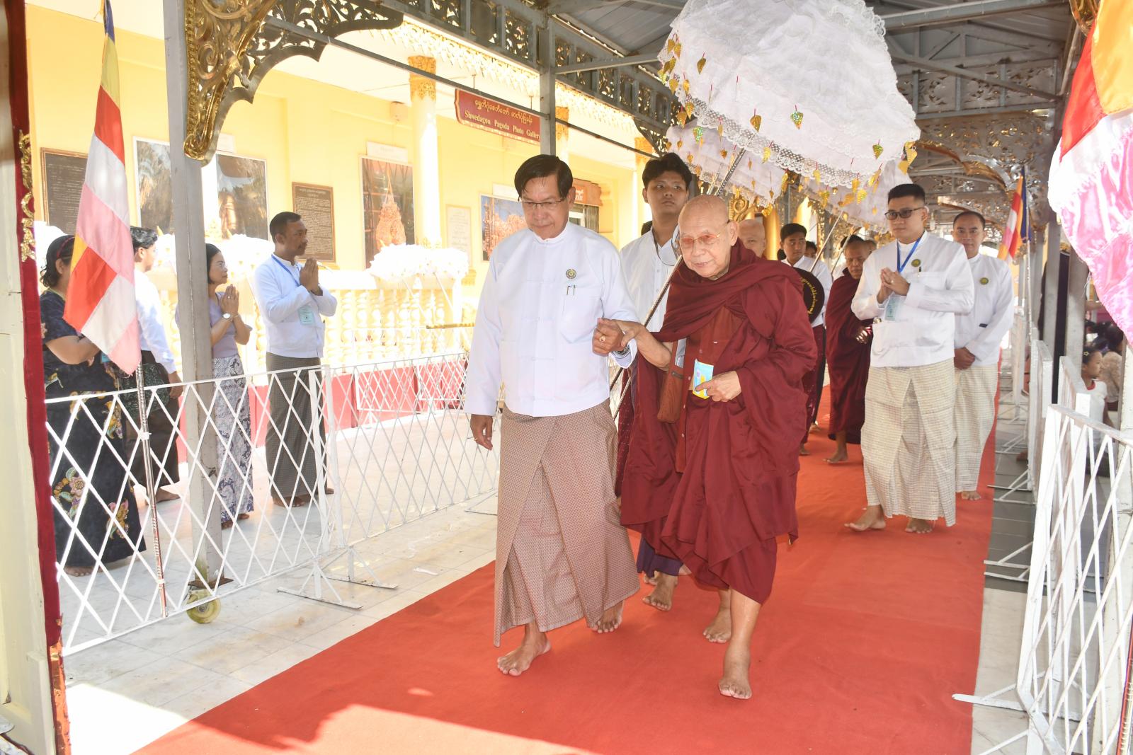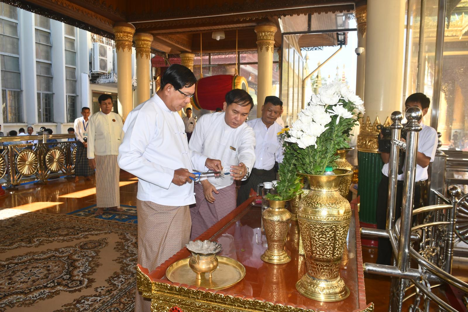 ဦးစွာ ရန်ကုန်တိုင်းဒေသကြီး ဝန်ကြီးချုပ် ဦးစိုးသိန်းနှင့် တိုင်းဒေသကြီးအစိုးရအဖွဲ့ဝင်များသည် ရွှေတိဂုံစေတီတော်တောင်ဘက် ဧည့်ခံတန်ဆောင်းတွင် ရွှေတိဂုံစေတီတော်မြတ်ကြီးအား ပန်း၊ ရေချမ်း၊ ဆီမီး များ ဆက်ကပ်လှူဒါန်းကြသည်။
