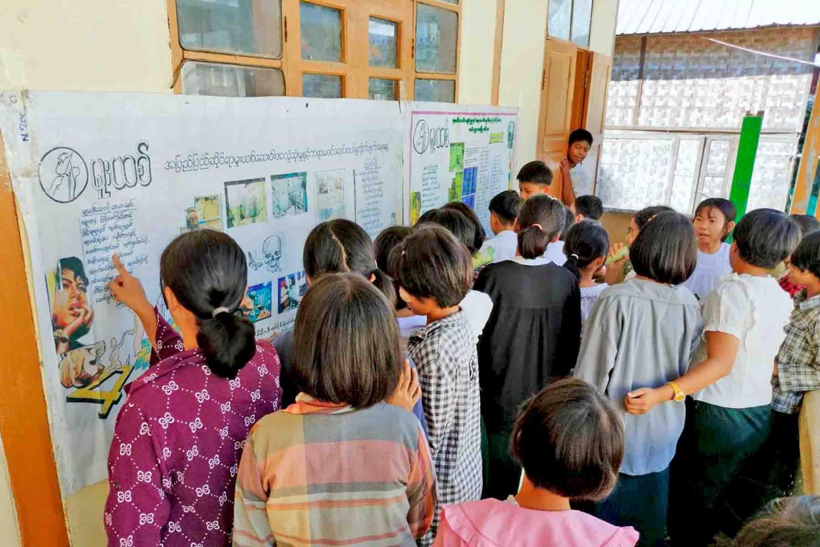 ထို့နောက် မြို့နယ်ဦးစီးမှူးနှင့် ဝန်ထမ်းများက မူးယစ်ဆေးဝါးတားဆီးကာကွယ်ရေးအကြောင်းသိကောင်းစရာ အသိပညာပေးနံရံကပ်စာစောင်များကို ခင်းကျင်းပြသပေးရာ ကျောင်းသားကျောင်းသူများက စိတ်ဝင်တစ်စား လေ့လာဖတ်ရှုကြကြောင်း သိရသည်။