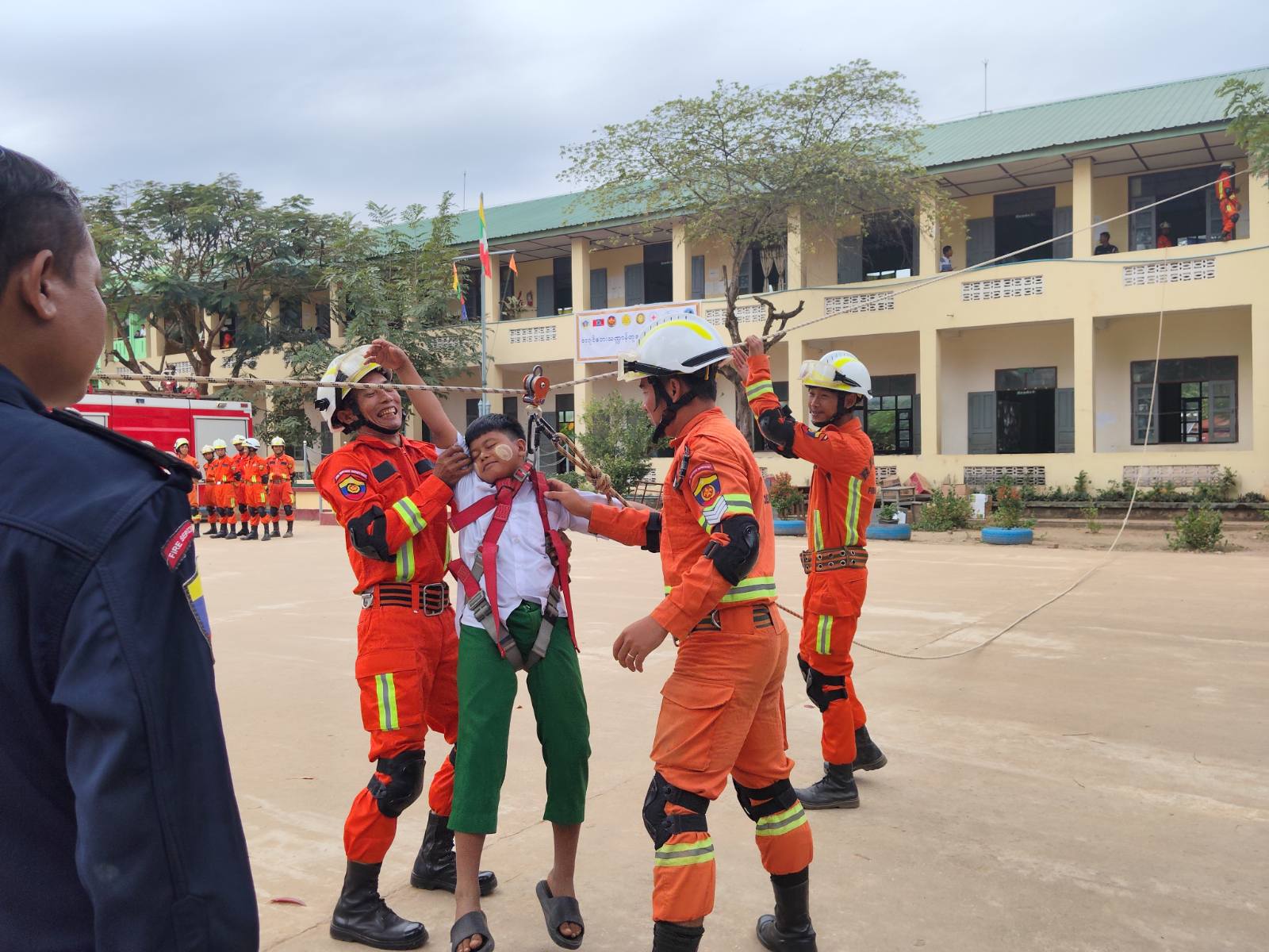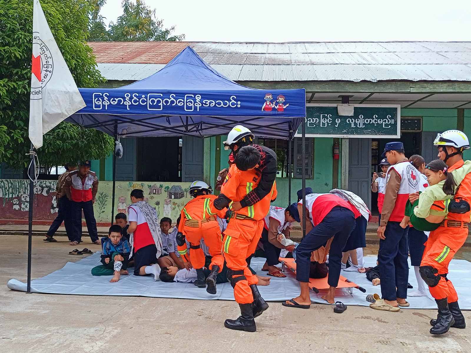 ဦးစွာ မြို့နယ်စီမံခန့်ခွဲရေးနှင့်အုပ်ချုပ်ရေးကော်မတီဥက္ကဋ္ဌ ဦးအားလွန်ကအဖွင့်အမှာစကားပြောကြားပြီး မြို့နယ်မီးသတ်ဦးစီးဌာနမှ မြို့နယ်မီးသတ်ဦးစီးမှူး ဦးရဲလင်းအောင် ဦးဆောင်သော မီးသတ်တပ်ဖွဲ့ဝင်များ၊ ခရိုင်ဘေးအန္တရာယ်စီမံခန့်ခွဲမှုဦးစီးဌာနမှ လက်ထောက်ညွှန်ကြားရေးမှူး ဒေါ်စန္ဒာရွှေနှင့်ဝန်ထမ်းများ၊ မြန်မာနိုင်ငံကြက်ခြေနီအသင်းအဖွဲ့ဝင်များ၊ ဌာနဆိုင်ရာအကြီးအကဲများ၊ အမျိုးသမီးရေးရာအဖွဲ့ဝင်များ၊ မိခင်နှင့်ကလေးစောင့်ရှောက်အသင်းအဖွဲ့ဝင်များ၊ ကျောင်းသား၊ ကျောင်းသူများက သဘာဝဘေးအန္တရာယ်ဆိုင်ရာ ငလျင်ဘေးအန္တရာယ်ဖြစ်ပွားလာပါက သဏ္ဌာန်တူ ဇာတ်တိုက်လေ့ကျင့်သရုပ်ပြမှုကို ပူးပေါင်းပါဝင်ဆောင်ရွက်ခဲ့ကြကြောင်း သိရသည်။